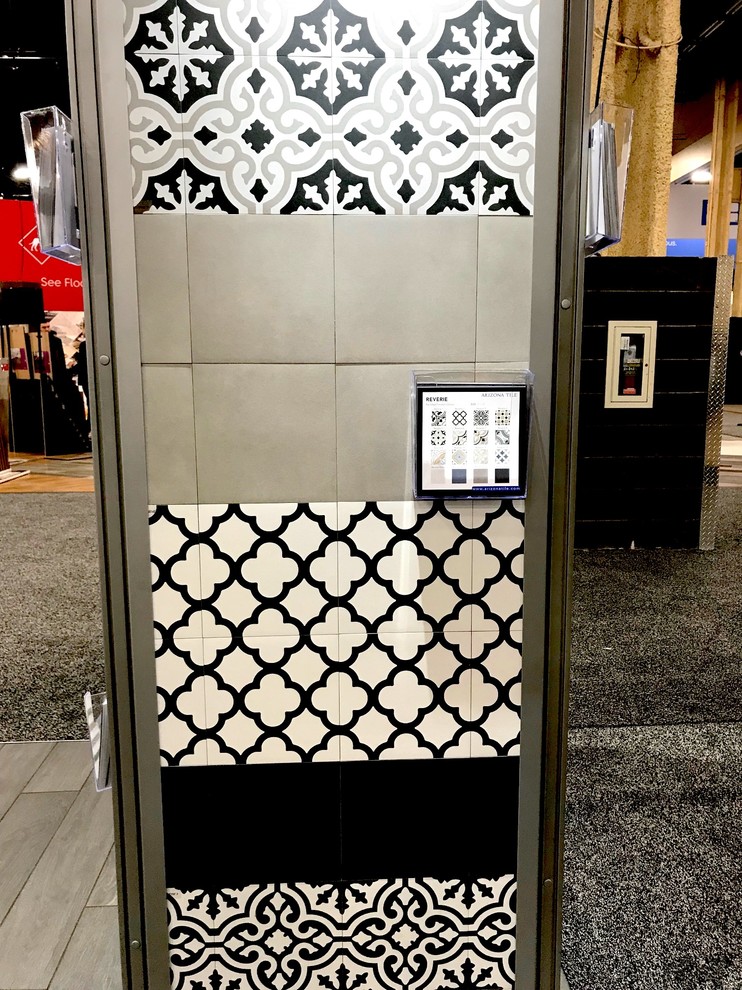 Arizona Tile’s Reverie collection features geometric and encaustic-style designs on several of its 8-by-8-inch porcelain tiles. They pair nicely with the collection’s corresponding solid-color neutral tiles.