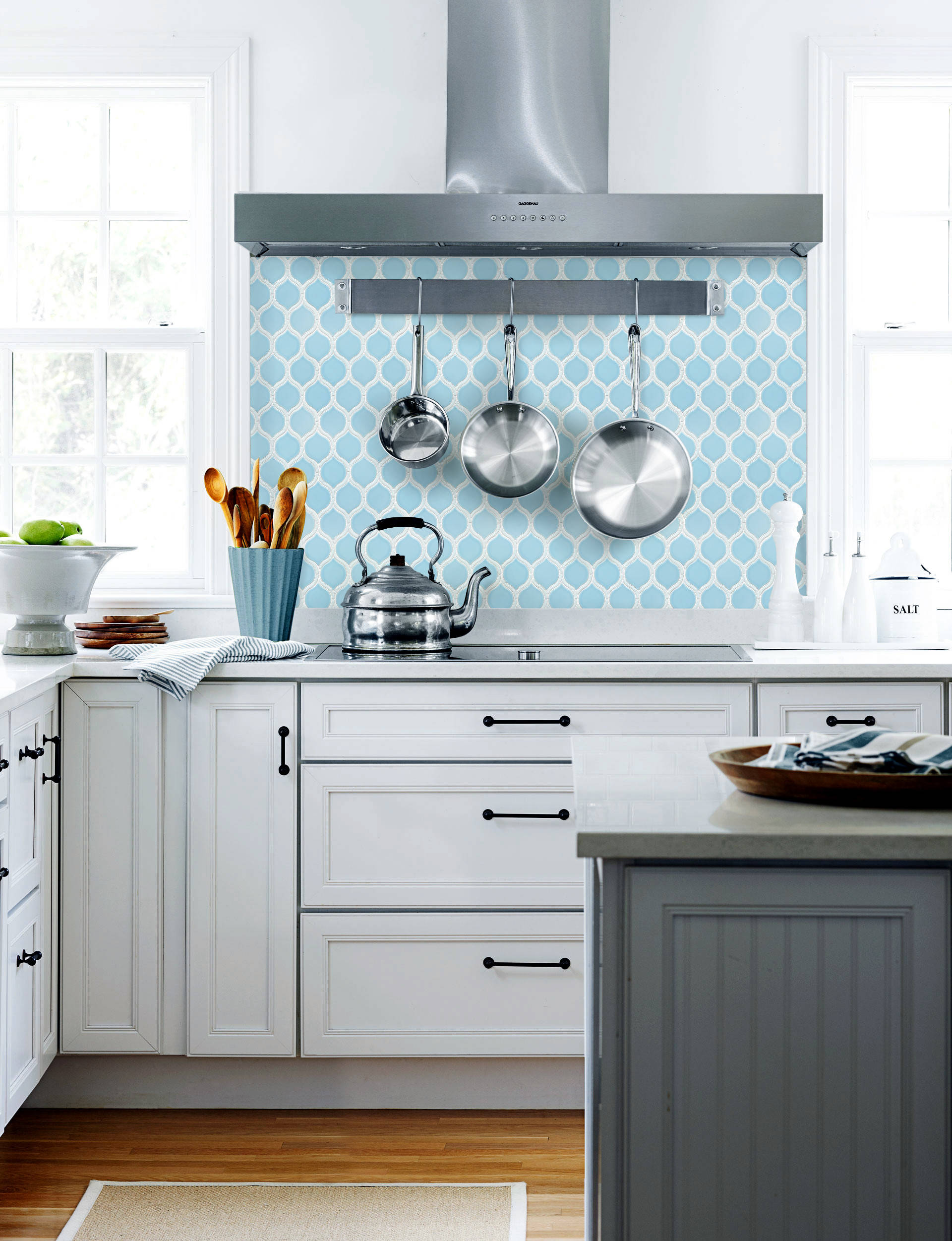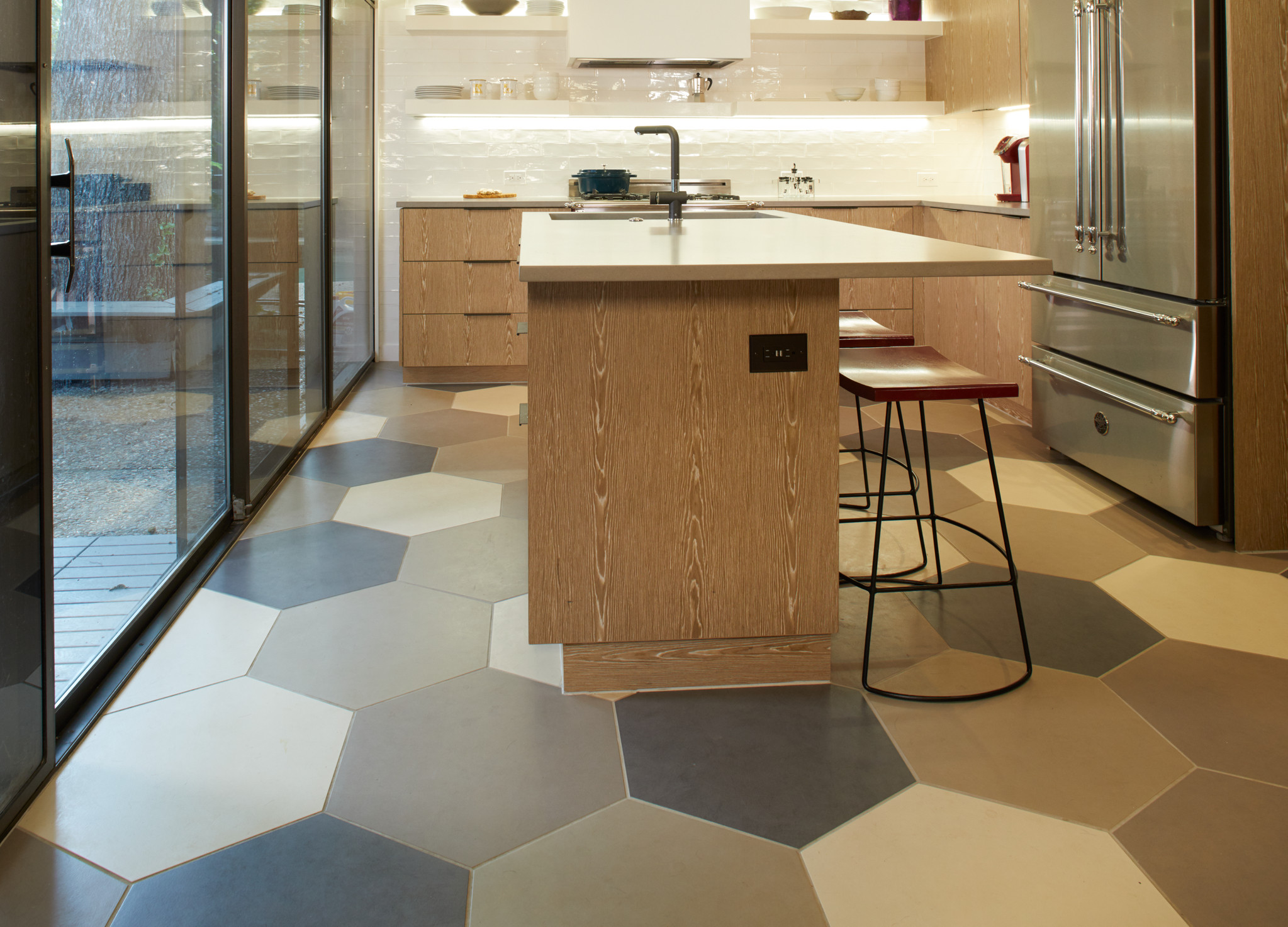 “Geometrics are thriving right now,” says Amber Leigh Martinson, director of marketing at Daltile. Though geometrics have been hot in recent years, mixing those patterns with neutral colors is now trending in a big way, she says. The company’s Bee Hive tile, shown here, comes in a variety of large-format hexagonal shapes in both solid tones and geometric patterns.