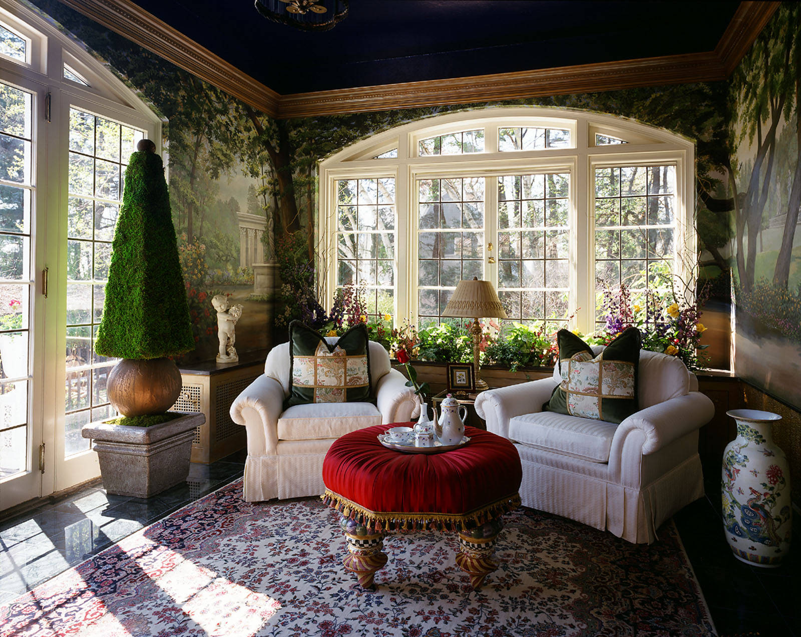 Be like Alice and step through a mirror into an alternate reality (or just enjoy looking at them). Mirrors need not be confined to the indoors – have you ever seen them placed on a hedge like this? The frames make the hedge itself become a work of art and the mirrors reflect other greenery beautifully. Hang a chandelier and wait for the Mad Hatter to come to tea.