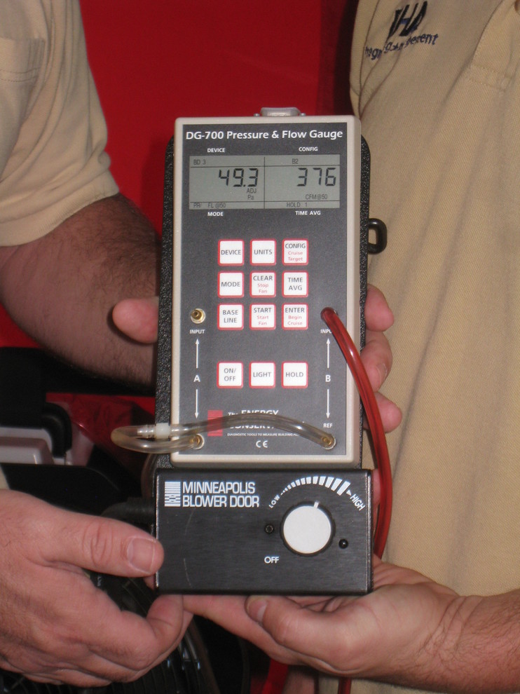 One way the Passive House standard verifies the absence of air leakages is with the Blower Door Test, in which the entire house is closed up and air is pumped inside. A gauge, shown here, then measures the air-flow rate relative to the volume of the house.