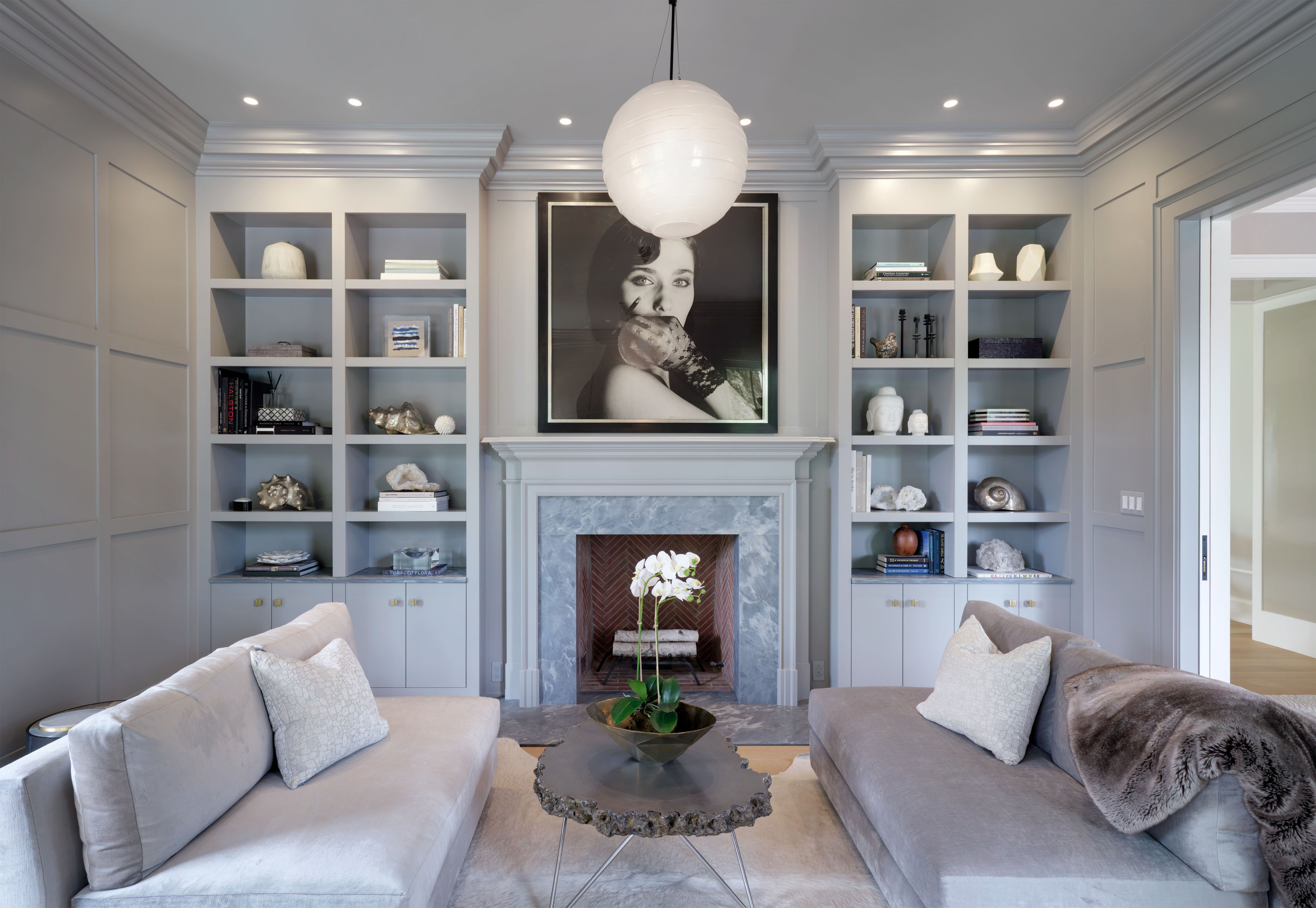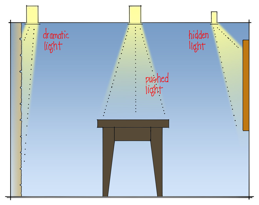 1. Dramatic light. Like a spotlight on a stage, a strong beam of light shining on a prized painting or statue draws our attention. Recessed downlights can also add significant drama to a space by highlighting architectural features like the stone face on this fireplace.