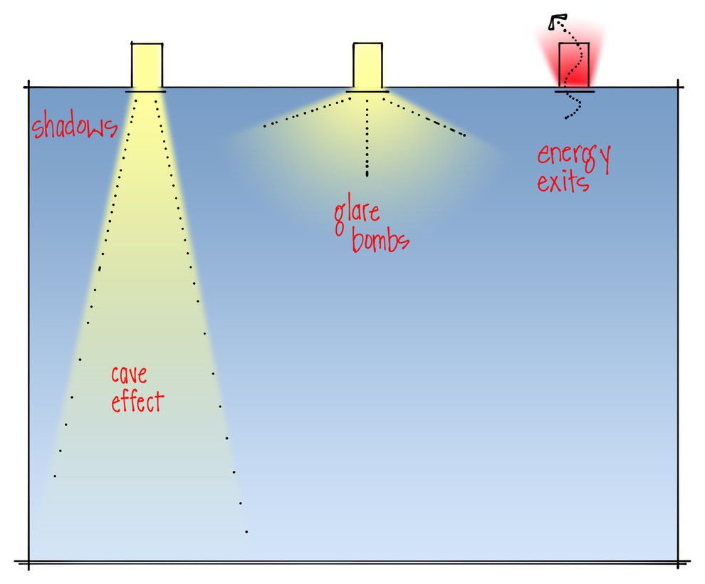 But like most things in life, recessed lights are not perfect. Three common problems created by recessed downlights are the “cave effect,” “glare bombs” and “energy exits.” Read on to learn more about each of these lighting effects and how to avoid them.