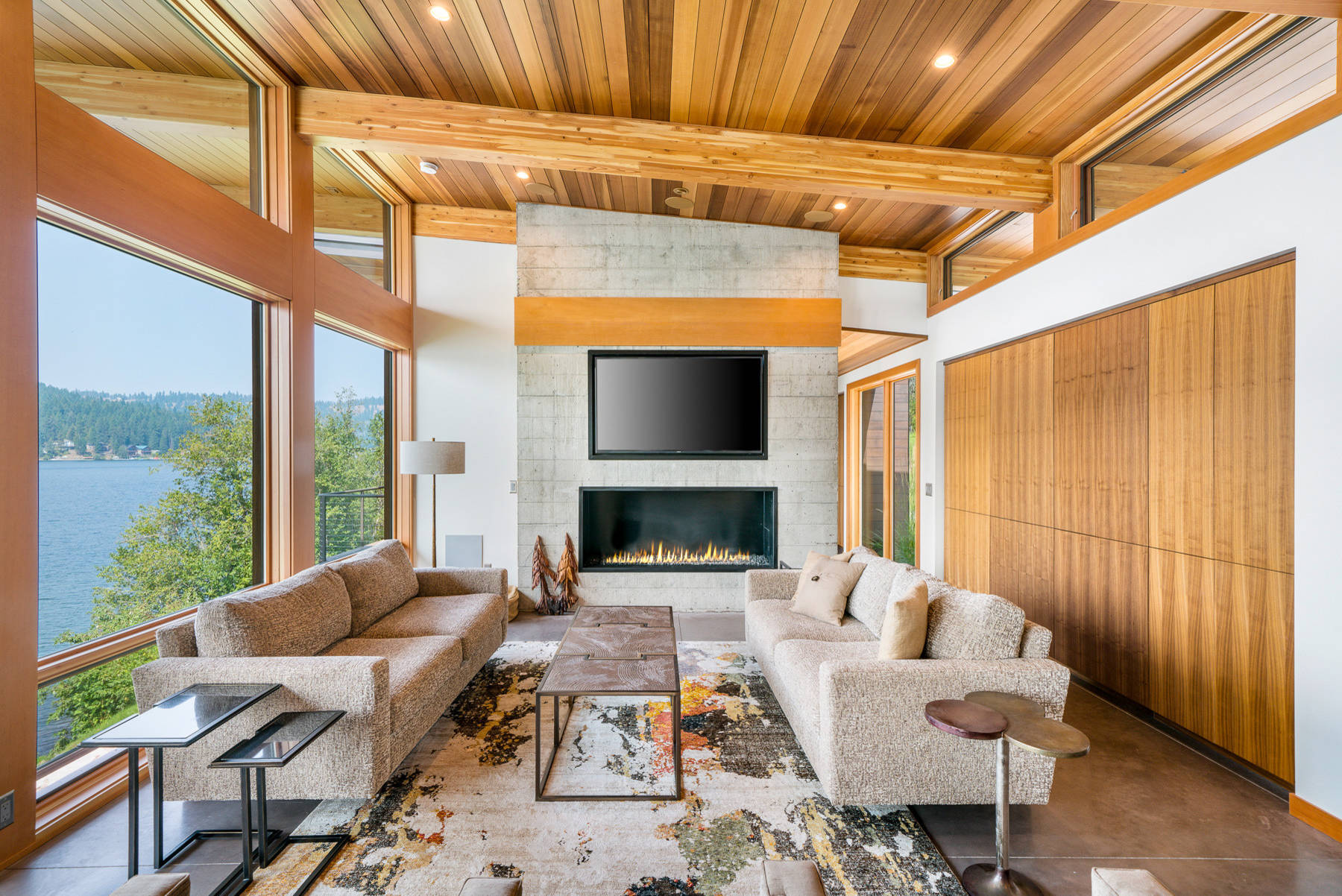 2. Pushed, or focused, light. Ambient light sources like pendants and lamps are not great at “pushing” usable light down to countertops, tables and reading chairs because their light beams break up before reaching their destination. Recessed downlights do this better. They also excel at illuminating double-height spaces, like the one shown here, especially when used with narrow beam spreads.