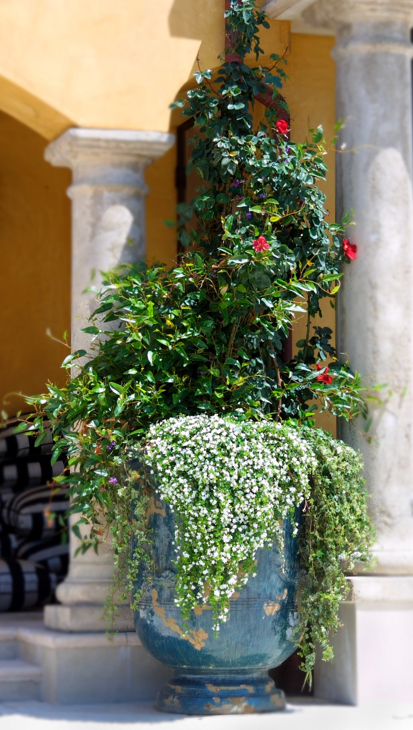 Matched pots with tropical-flavor plantings make a statement strong enough to pull the eye away from the stunning backdrop. Try: