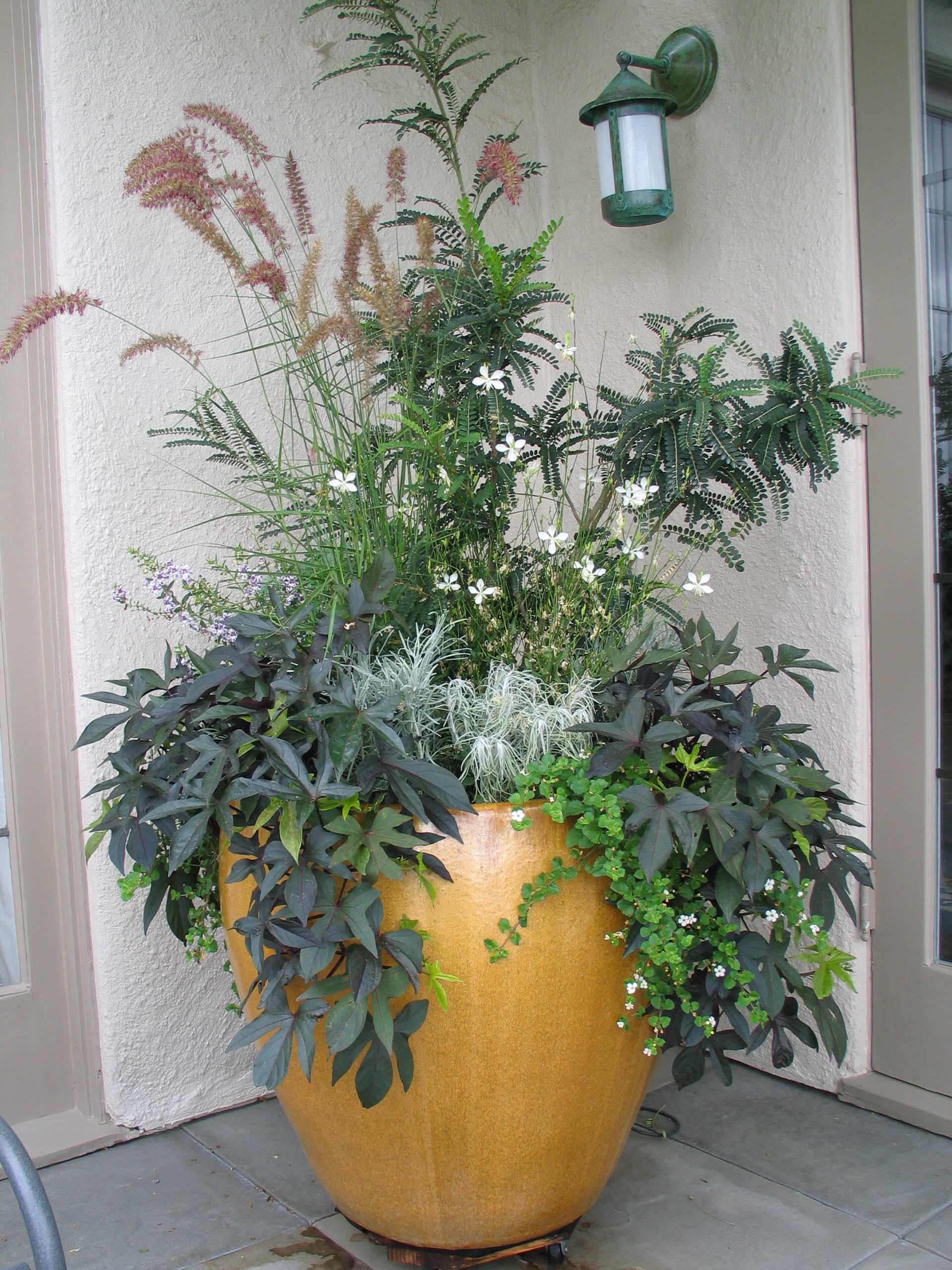 This combo will need regular tending: pruning and tip pinching to keep larger plants in line, and digging up, dividing and removing a portion of Sweet Potato Vine "potatoes" when they're dormant to keep them from crowding out the other plants.