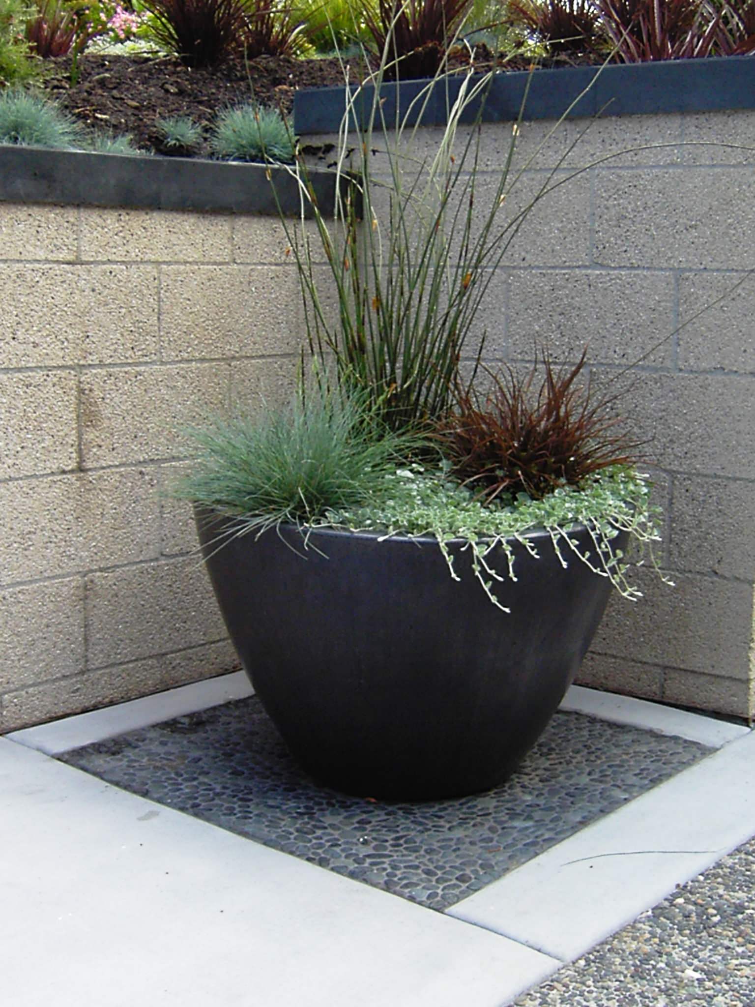 Need something bigger than a single pot? The same thriller-spiller-filler formula can be expanded to a group of pots that work together to create a unified composition. This grouping of pots filled with flax (Phormium var.) and assorted succulents follows the thriller-spiller-filler formula.