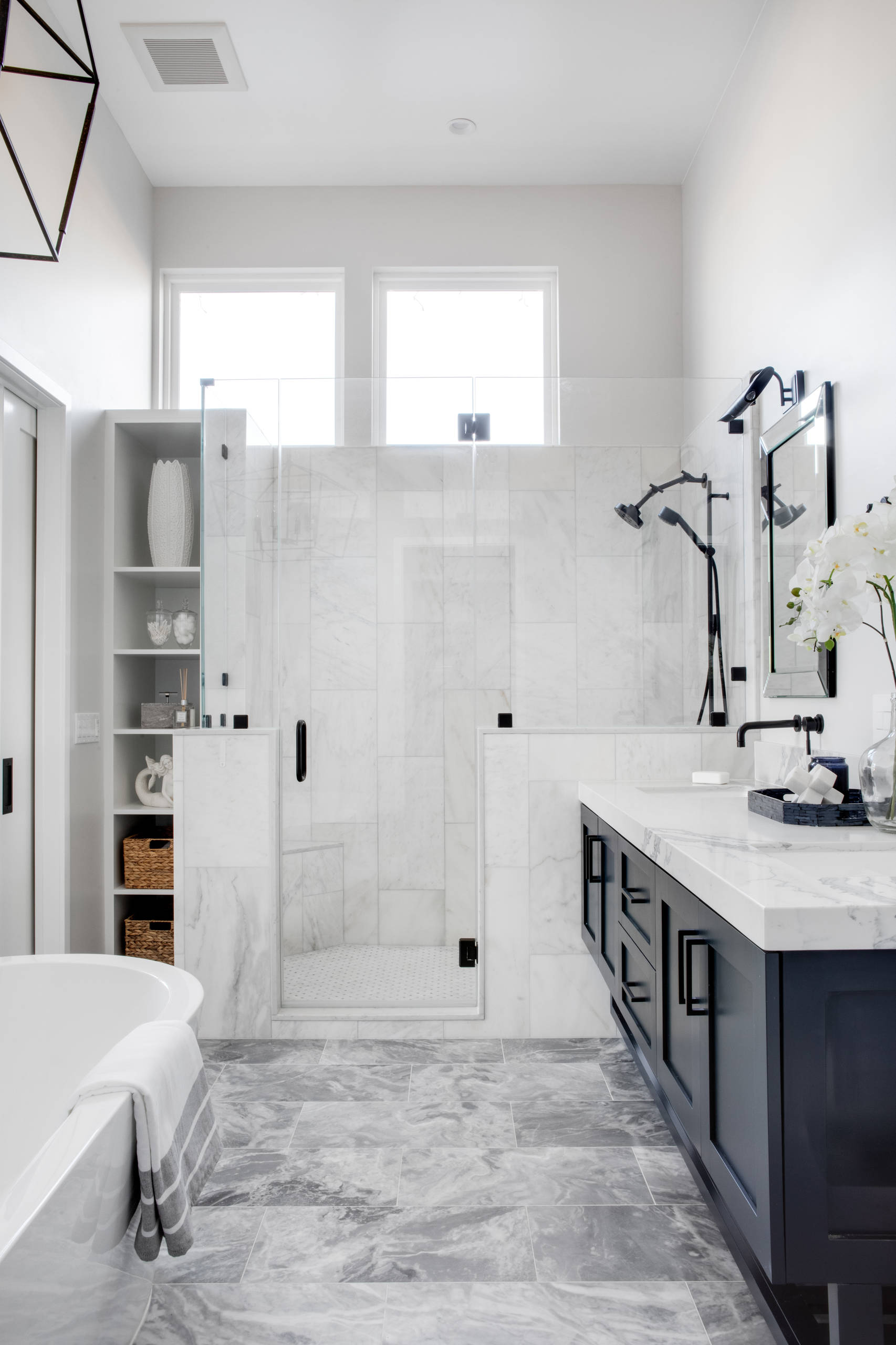Many would have opted to tear down and rebuild this run-down house in Pittsburgh, but these homeowners turned to Katy Popple Design to help them renovate instead. She used classic elements like white subway tile, black hexagonal floor tile and quartzite slabs to suit the 100-year-old home. But details such as darker grout, elongated subway tile, clear glass divider and black fixtures update the look.