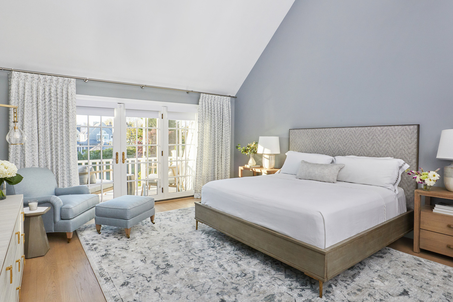 Interior designer Darci Hether used a coastal palette of creams, grays and blues throughout this Westhampton Beach, New York, home. Blue-gray walls and accents provide a cool feeling on hot days, while soothing cream, tan, brass and wood tones add warmth. And in addition to the cozy bed, a comfy reading chair with an ottoman and a private balcony offer two more reasons not to leave this bedroom.