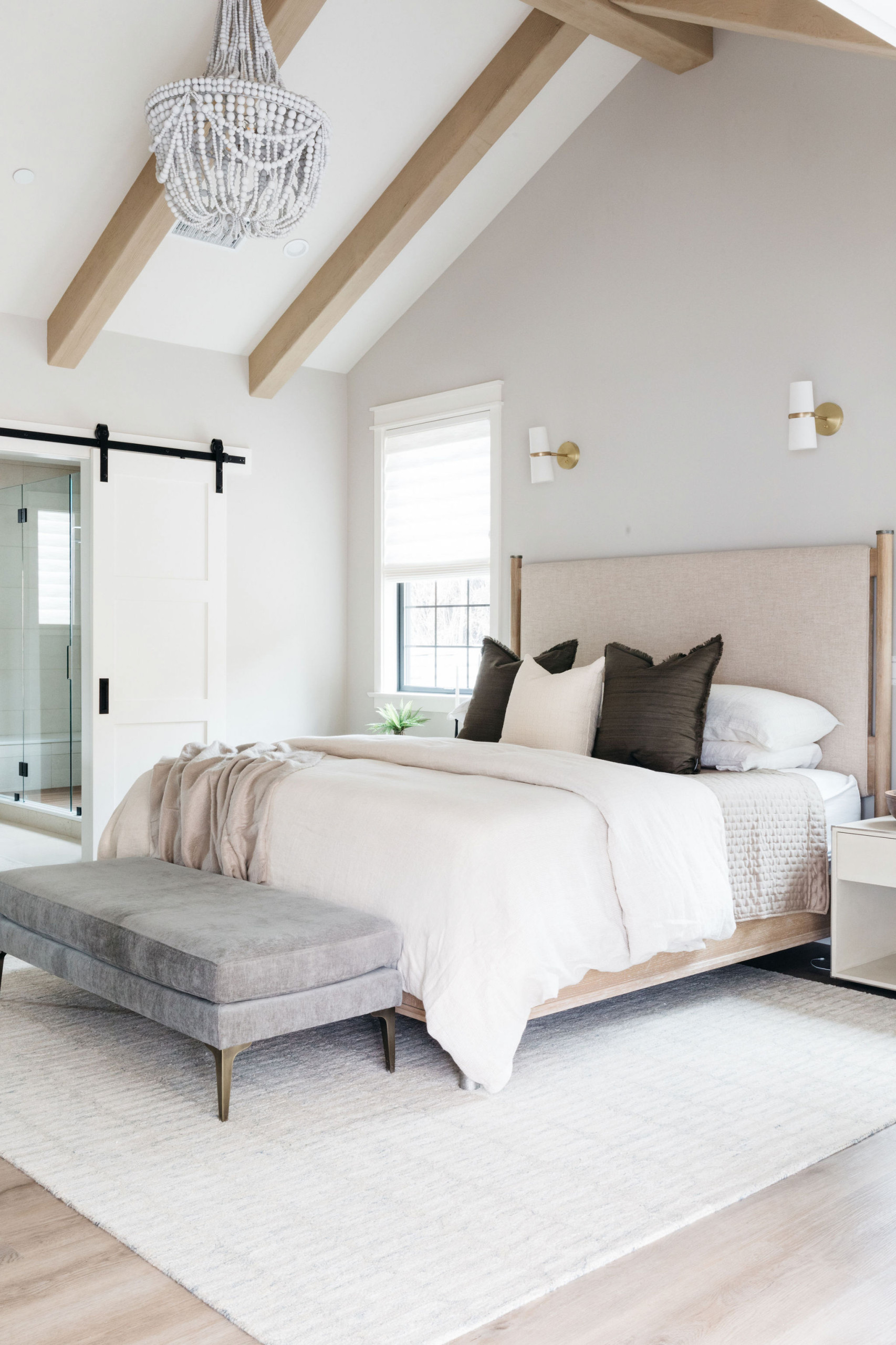 Layers of bedding in neutral colors and a variety of textures create nuanced style in this Monterey Park, California, bedroom by Realm Design. The light tones of the wood on the furniture and ceiling beams and the warm metal finishes add coziness to the large space. A tall headboard with reading sconces above helps visually bring the vaulted ceiling down, while a remarkable beaded chandelier focuses attention up.