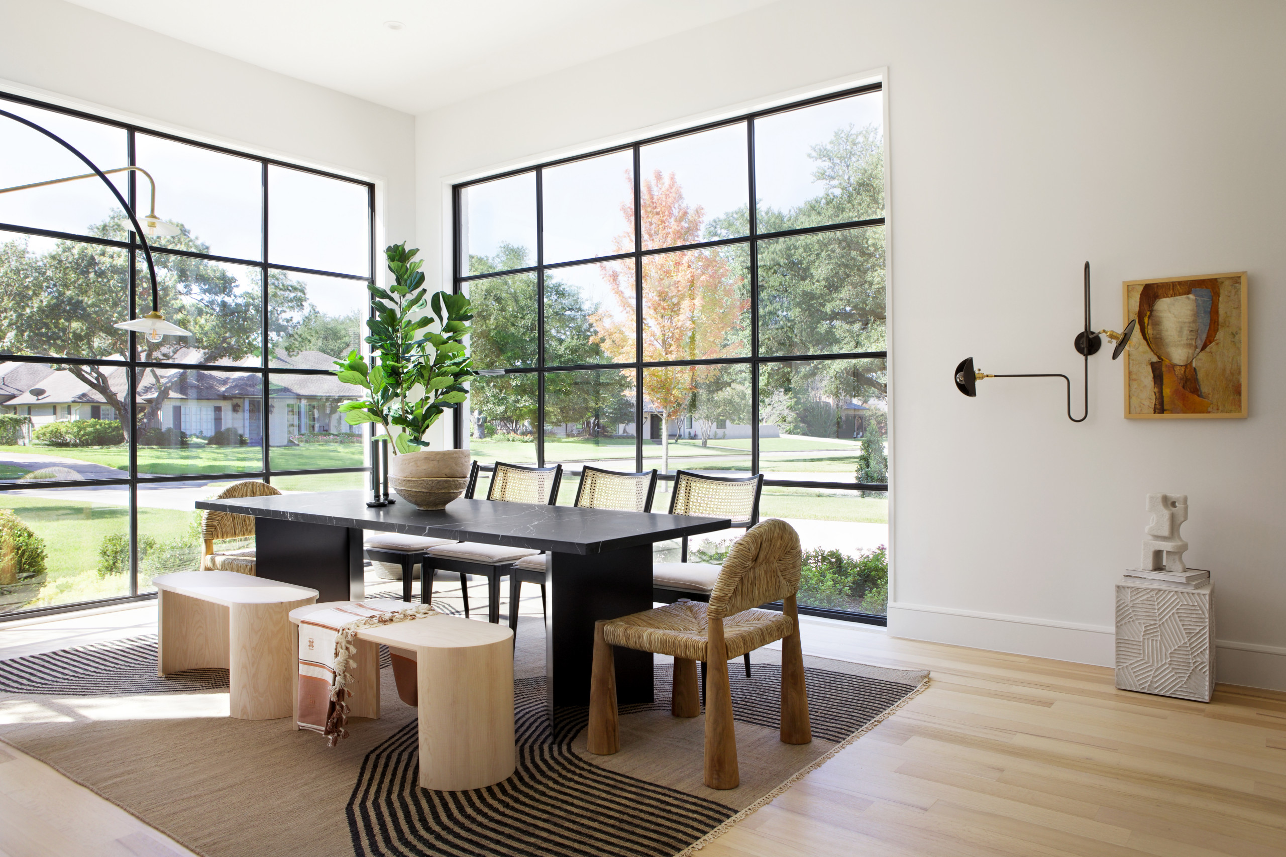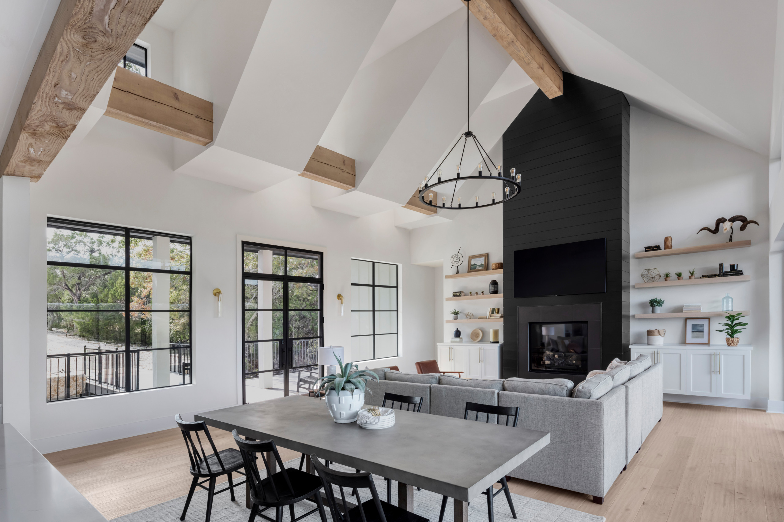 Designed by Danze & Davis Architects and built by Younger Homes, this modern farmhouse in Jonestown, Texas, features an open-plan dining and living room with white oak floors and a vaulted ceiling accented by rustic beams. Interior designer Haley Manning outfitted the dining space with a concrete-look table and black spindle-back chairs that match the black shiplap fireplace.