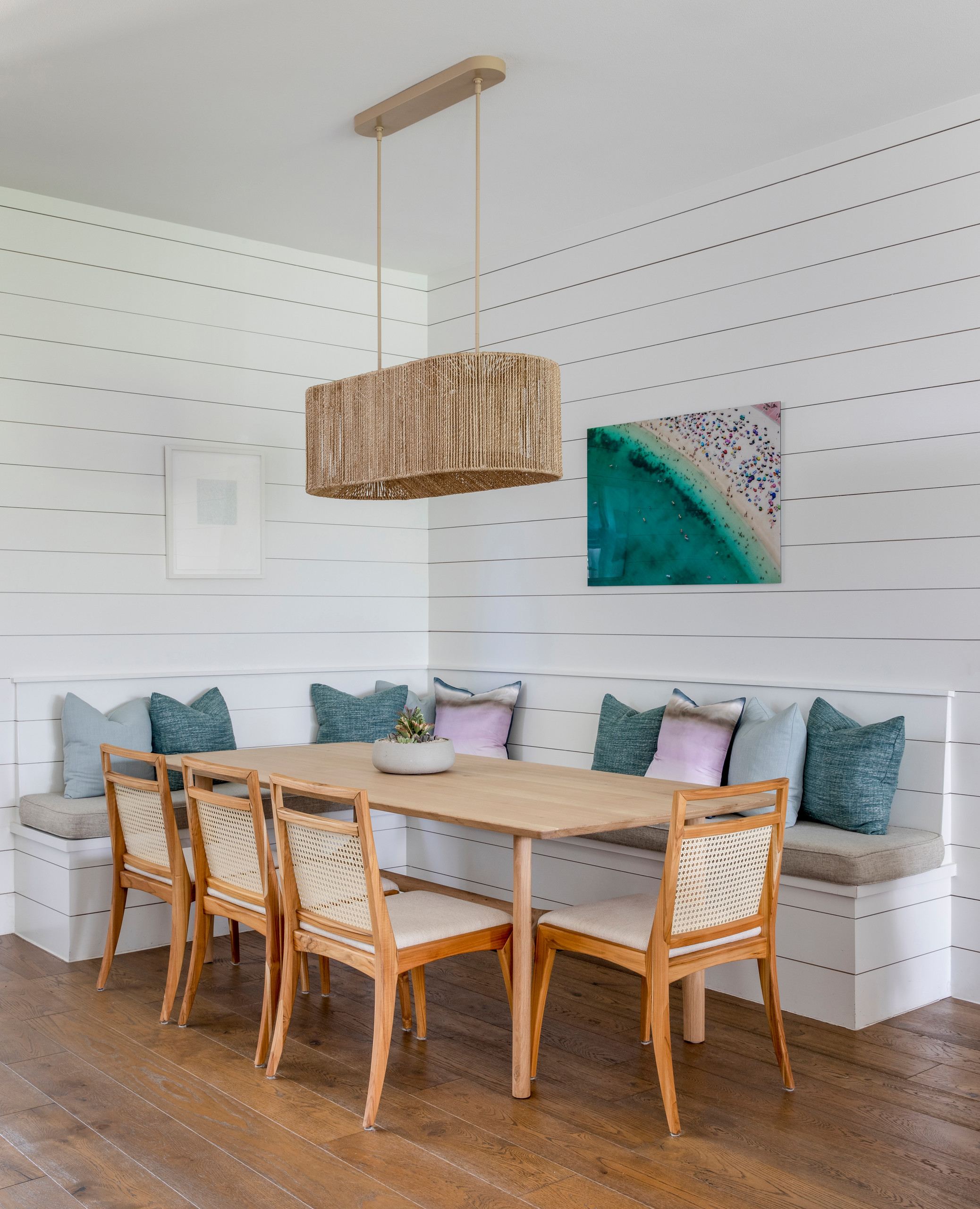 This dining space may be in landlocked Austin, Texas, but Bandd Design gave it seaside spirit with shiplap-covered walls and built-in seating, a woven light fixture and chairs, and aqua- and sand-colored upholstery. An aerial beach photo completes the scene.