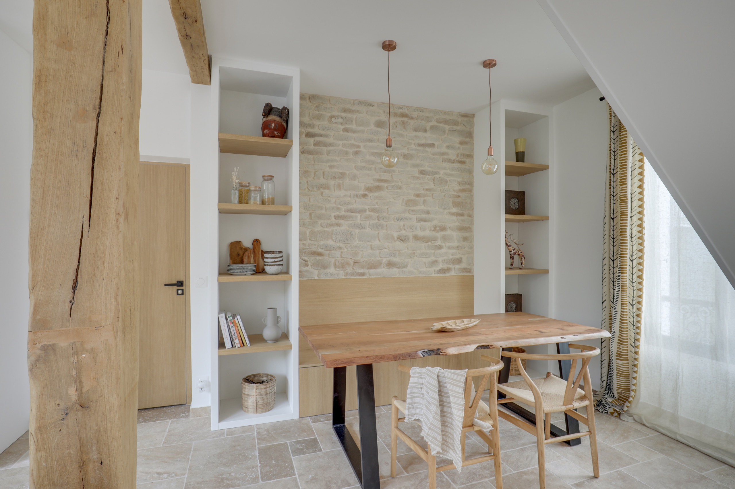 In the dining area of this 1930s home in La Garenne-Colombes, France, designer Rym Bencharif of Atelier Nyood combined a faux-stone wall with rustic beams, a steel-based acacia table and light wishbone-style chairs. The result is a modern spin on an authentic southern French kitchen.