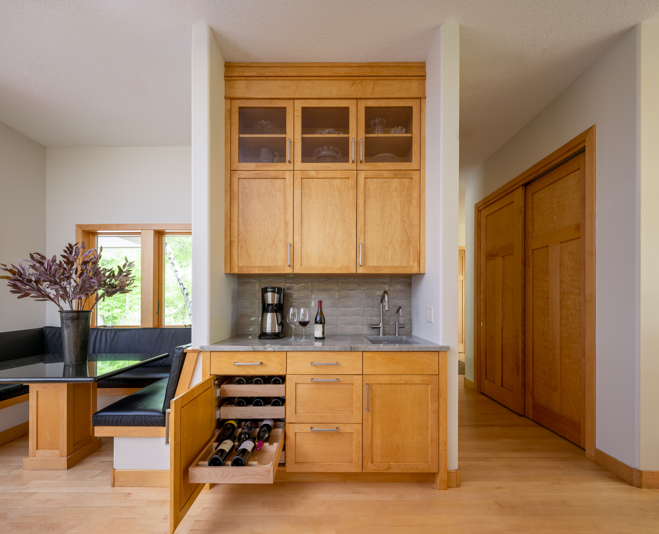 Maple cabinetry and a quartzite countertop lend a warm, earthy feel to this wet bar, which has custom cabinet pullouts for wine storage. Built into a Prairie-style Minnesota home designed by LiLu Interiors, the bar shares materials and space with the kitchen and built-in dining nook, the latter of which looks like the perfect spot to host a wine tasting.