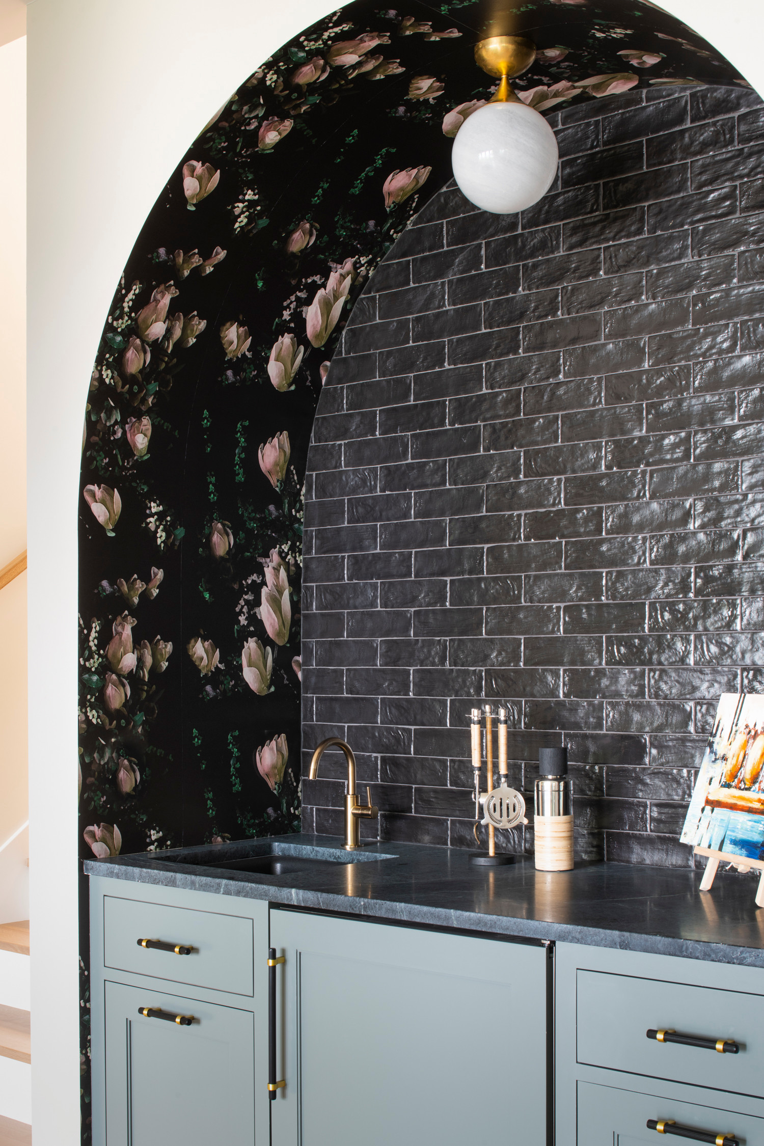 Studio M Interiors wallpapered the arch of this Minneapolis bar alcove with a dark floral wallpaper. In combination with the green lower cabinets, black tile backsplash and moon-like orb light, the blooms conjure a late-night cocktail party that’s spilled out into the garden.