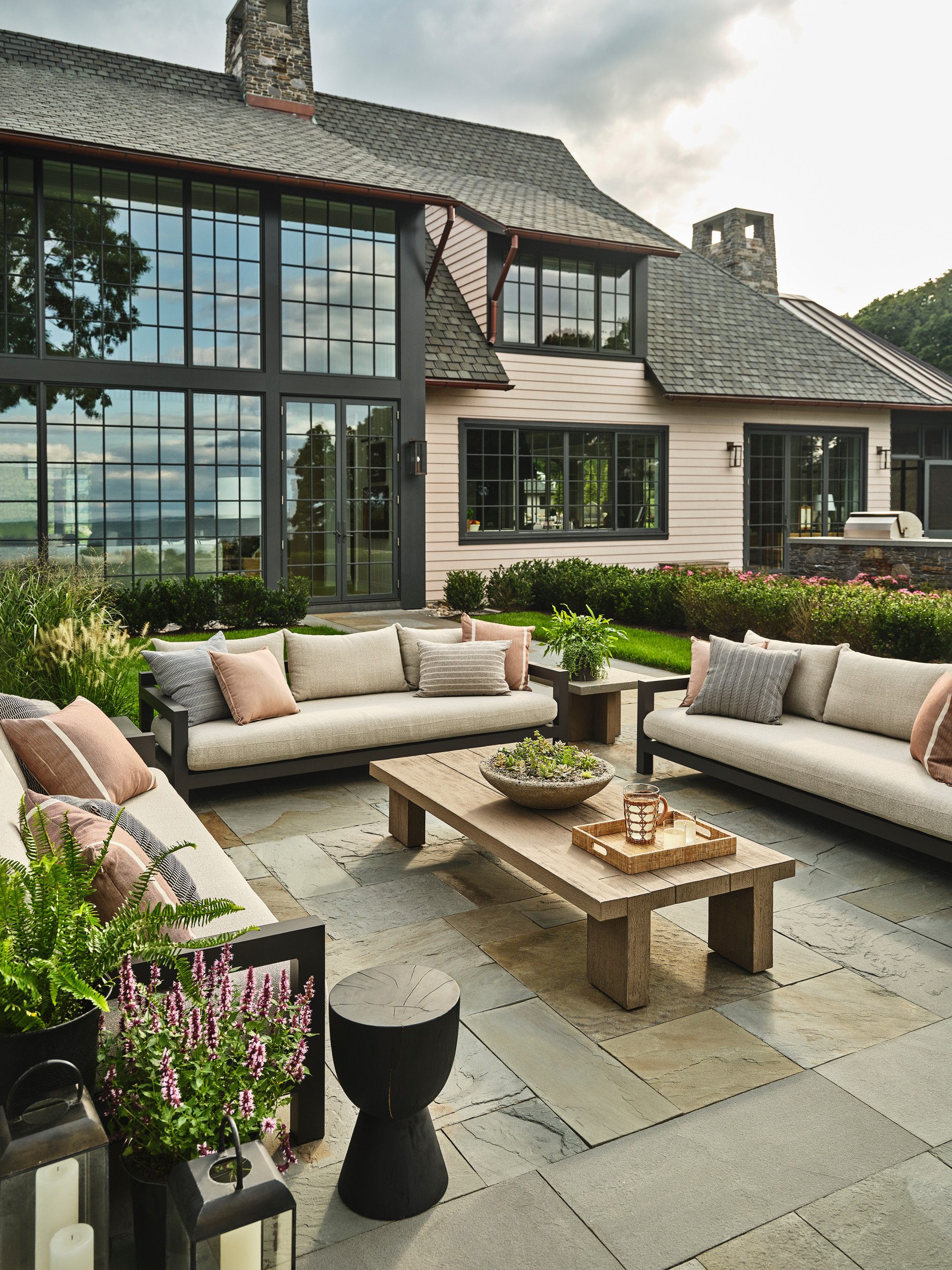 Located in a prime coastal spot, this Portland, Maine, home by Wright-Ryan Homes maximizes its panoramic views. The backyard patio opens directly to the water, where a U-shaped arrangement of outdoor sofas encourages lingering and conversation. Black sofa frames and matching side tables echo the home’s trim, while beige cushions subtly reference the exterior paint, creating a serene, effortlessly cohesive palette.