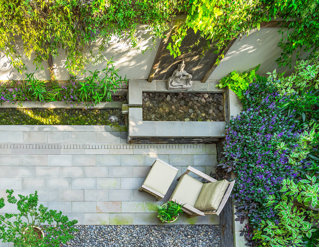 Other features of this patio. A water feature, including a 6-inch-wide rill, frames one side of the patio. Lotuses and water lilies grow in the rill, which also protects the plants growing behind it from the homeowner’s dog.