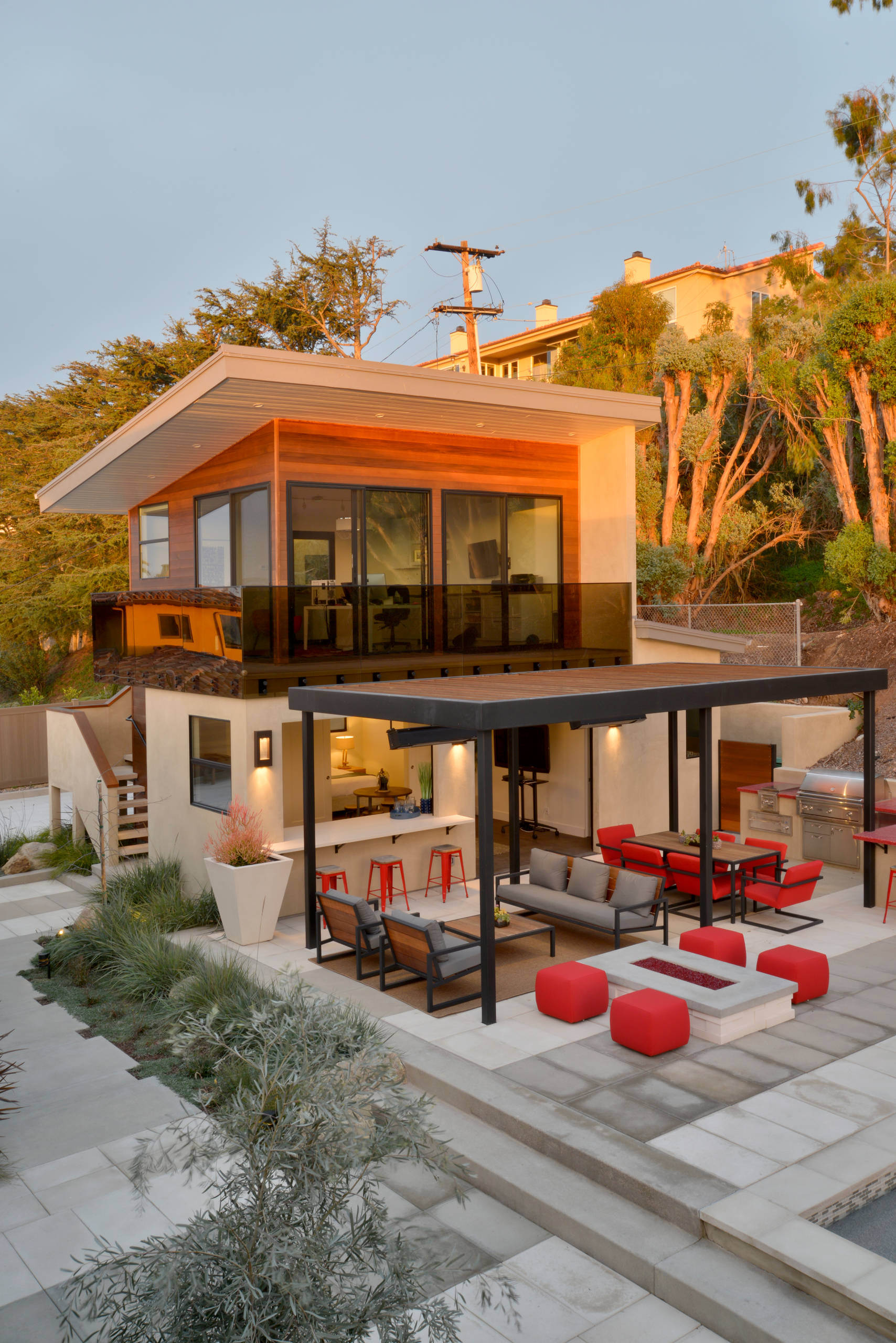 Other features of this patio. The freestanding pergola is made of black-painted steel tube with a western red cedar cover. Outdoor lights, patio heaters and a gas fire pit enable the outdoor space to transition seamlessly from day to night. An outdoor kitchen makes it easy for the party to keep going outside, with colorful red furniture creating a bold and inviting opportunity to lounge.