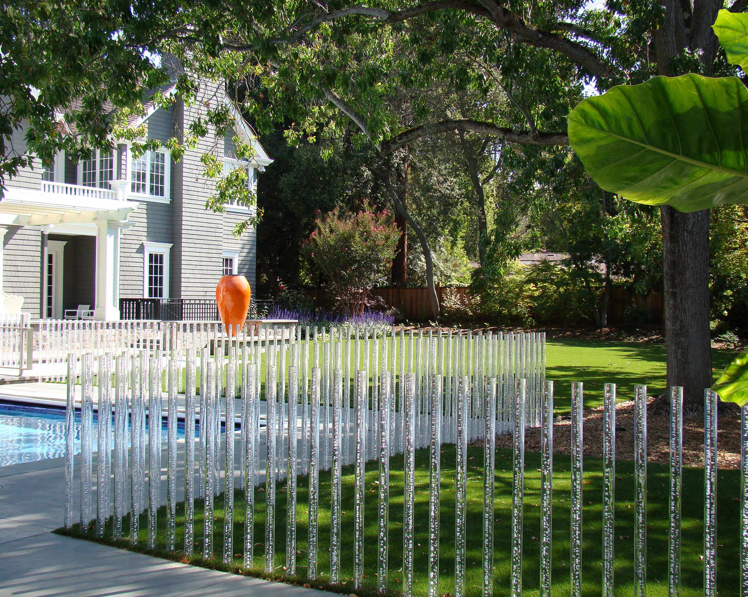 Here, Randy Thueme created an artful second line of defense with acrylic bubble rods. These support the main, code-compliant barrier of an automatic pool cover.