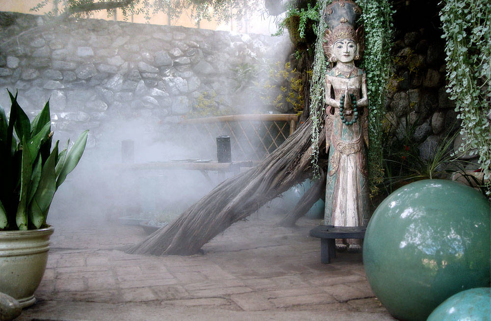 Consider mist or fog. Nothing creates mystique and stirs the imagination quite like mist or fog. Misting nozzles and ultrasonic foggers are available from specialty sources. Additionally, they do double duty to cool the garden on balmy days.