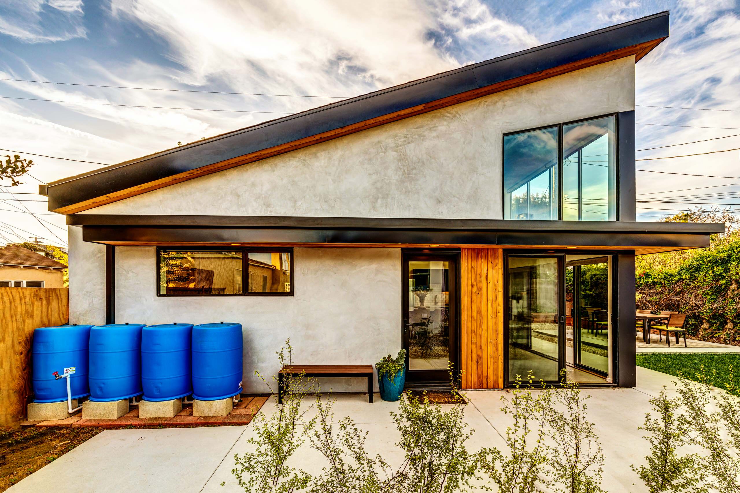 Store, slow, spread and sink runoff. Storing water is a great way to reduce irrigation demand and intercept runoff. In the space here, a roof downspout directs roof water to rain barrels for storage.