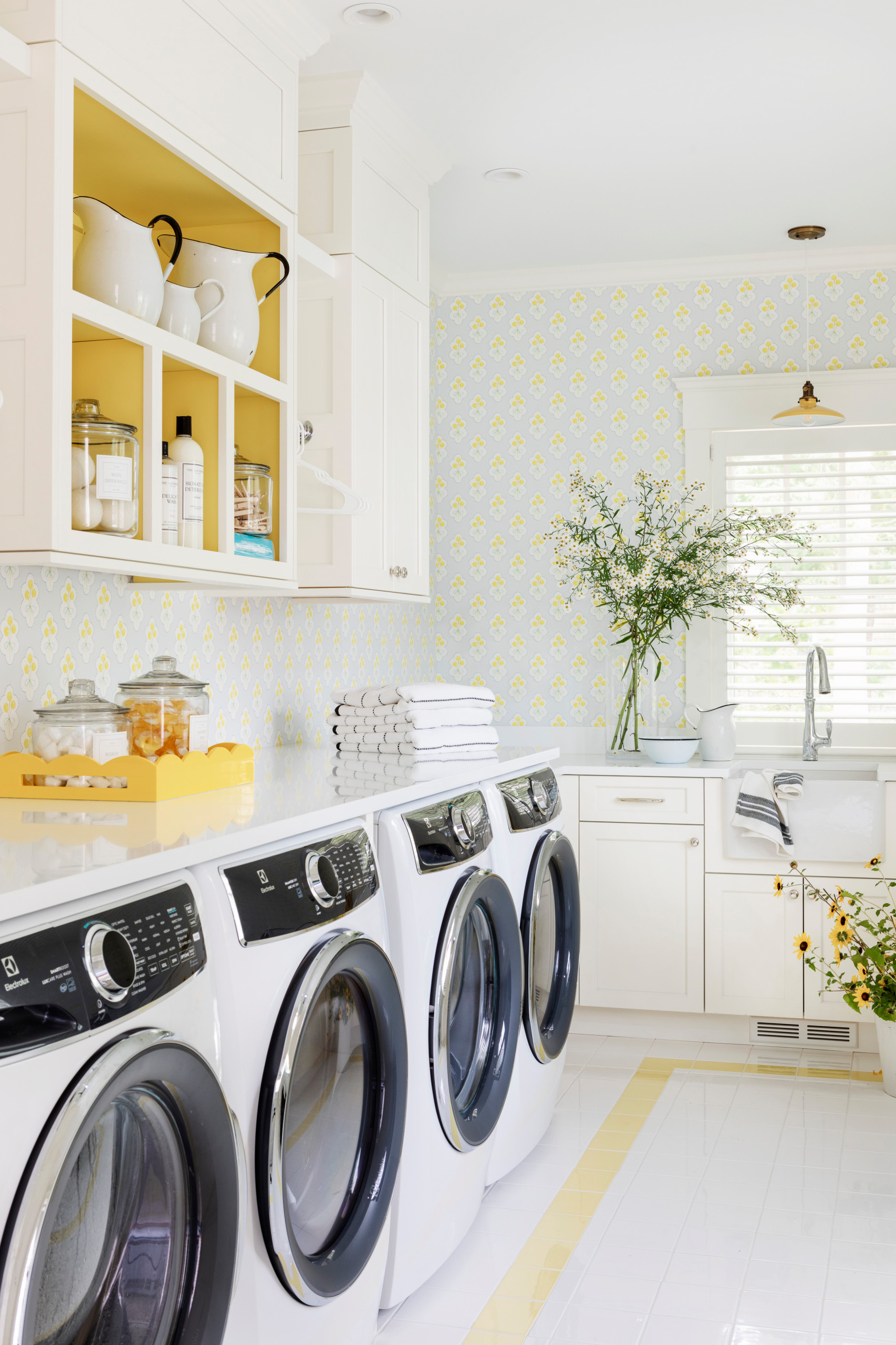 Lots of family and friends stay at this coastal home in Osterville, Massachusetts, which means lots of clothes, sheets and towels to launder. James Phillip Golden Architect made plenty of space for a pair of washers and dryers to handle it all. And sunny yellow accents in the wallpaper, cabinet, flooring and other details ensure a cheery atmosphere to get it all done.