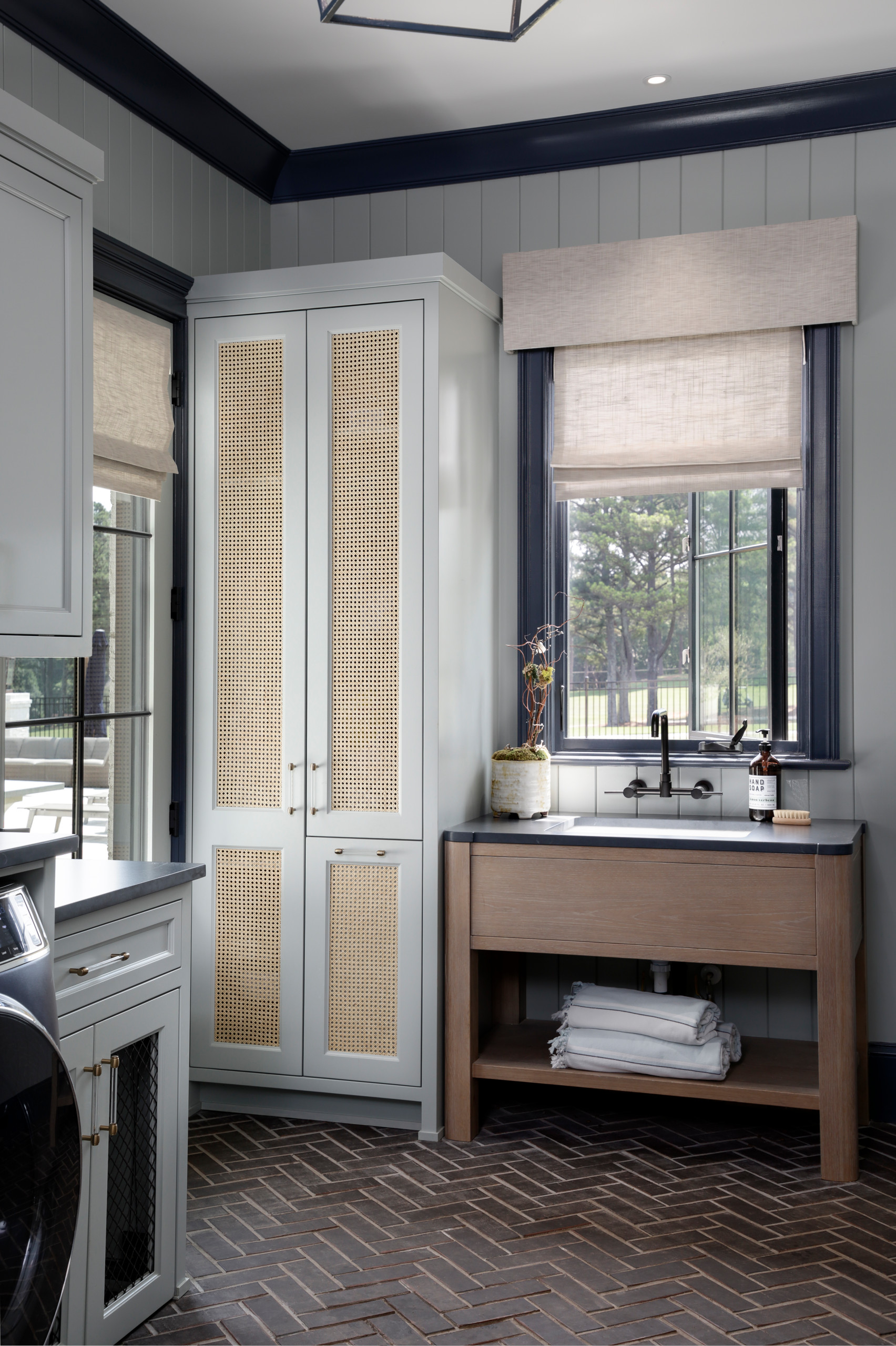 Abbi Williams of Red Door Design Studio layered a wonderful mix of textured materials in this Atlanta laundry room. A herringbone brick floor and painted wood-paneled walls stand up to the traffic of a busy family and its dogs. Caned cabinet door panels conceal drying racks and a handy pullout trash bin. A wood sink stand adds warmth.