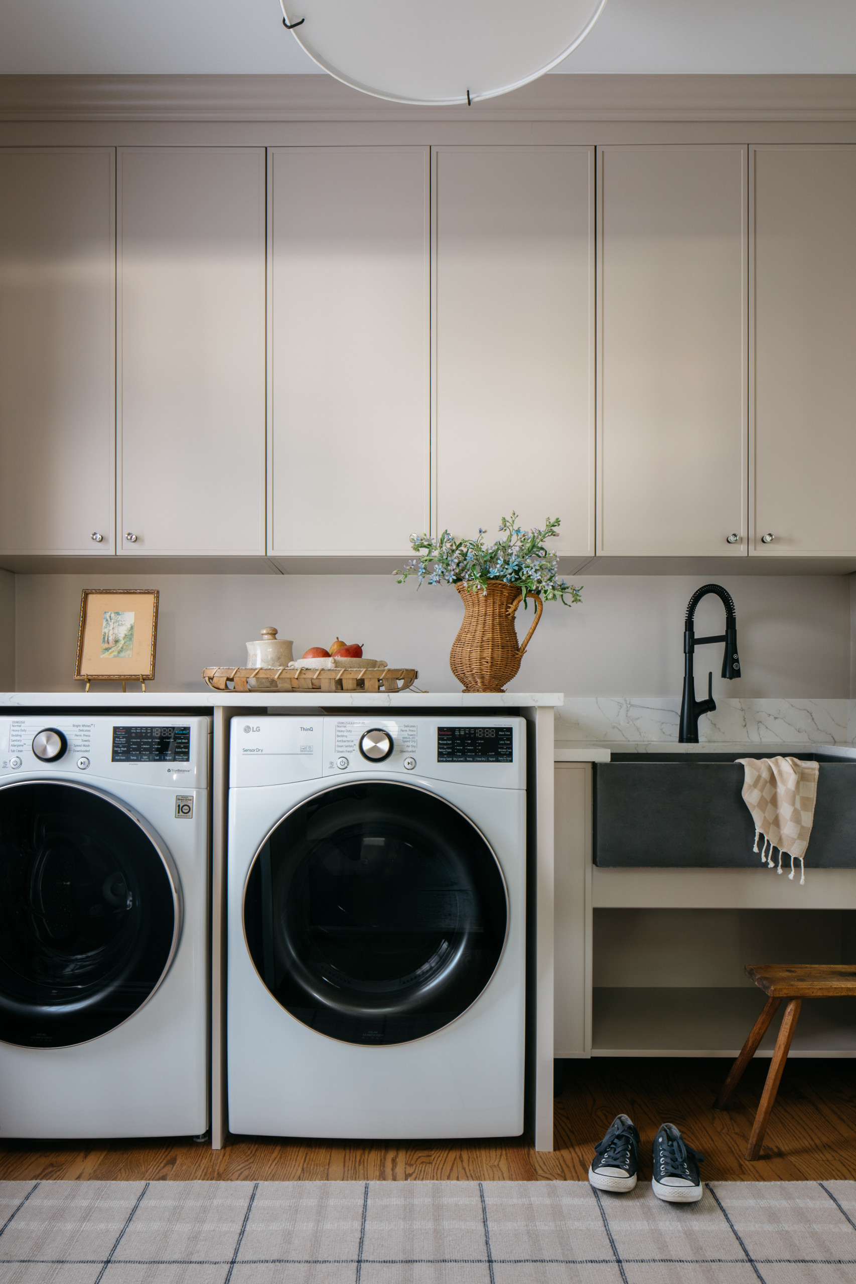 Large-format slate tile flooring and black appliances create striking contrast with the otherwise light finishes in this Los Angeles laundry room by Kevin Grace Design. Plus, the generous countertop length provides plenty of space to sort and fold clothes from the double washers and dryers.