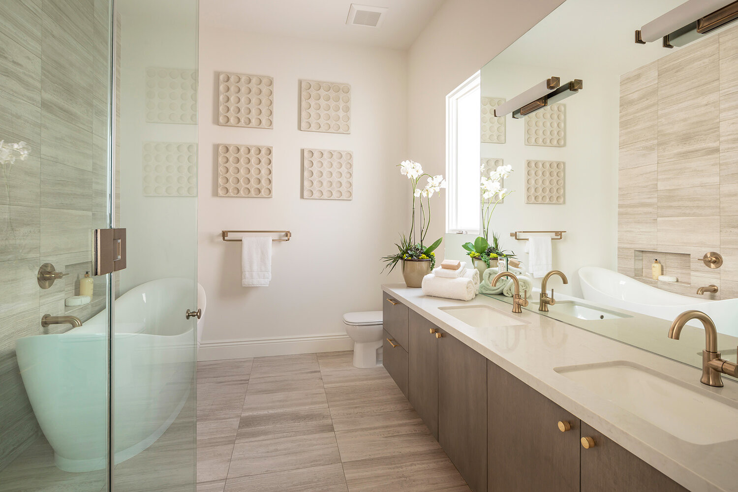 The large surfaces in a master bathroom — including its walls and floors, both inside and outside the shower — have a major impact on the room’s design. A bright accent wall can create a focal point in a room, while textured tile in neutral tones can add visual interest to a shower.