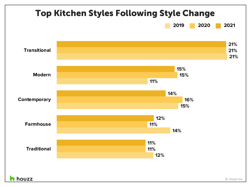 Most homeowners remodeling their kitchens (85%) are opting to change its style. For the remodeled kitchen, transitional is the most popular style (21%), followed by modern (15%), contemporary (14%), farmhouse (12%) and traditional (11%).