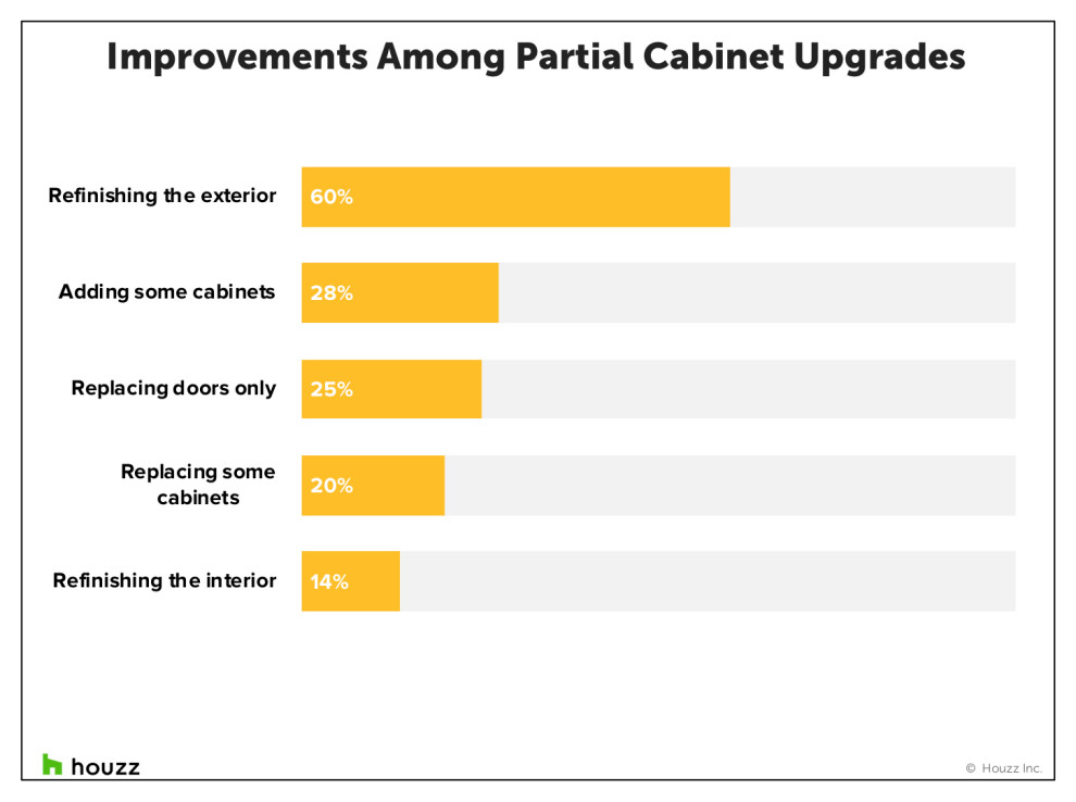 Among those homeowners choosing a partial cabinetry upgrade, the most popular upgrade is refinishing the cabinetry exteriors (60%). Twenty-eight percent of remodeling homeowners partially upgrading their cabinetry are adding some new cabinets — nearly four times as many as in the previous year. Others are replacing just the doors (25%), replacing some cabinets (20%) or refinishing cabinet interiors (14%).