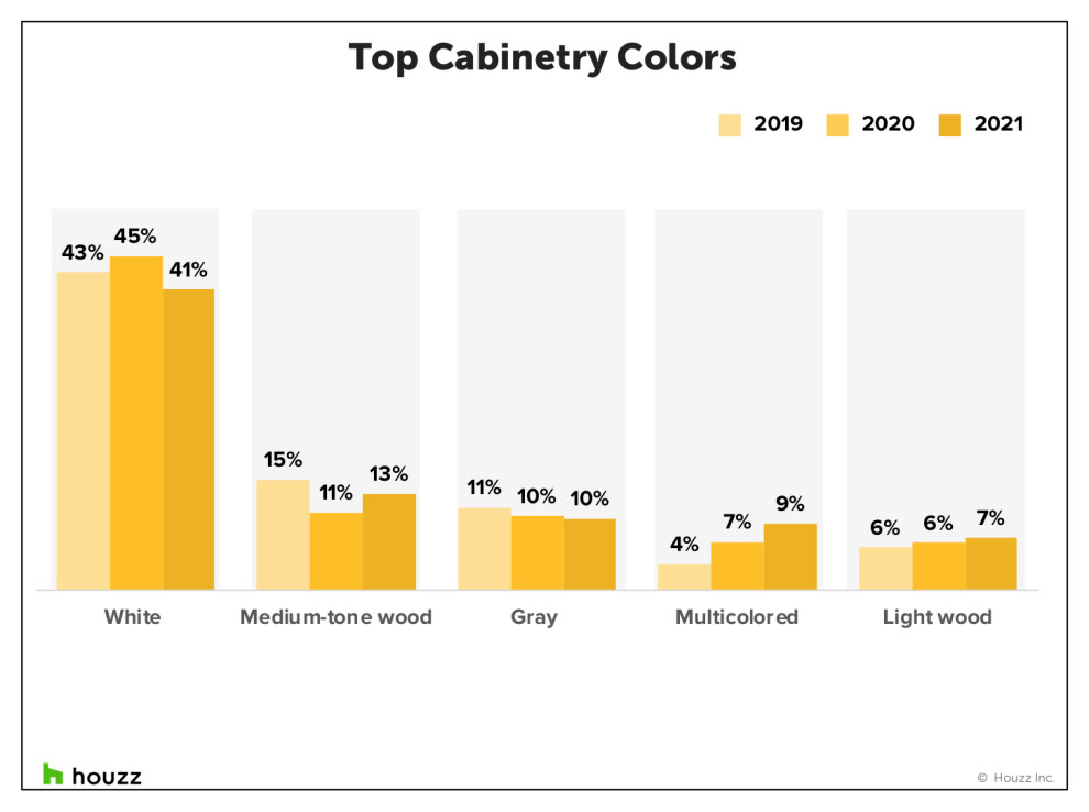Shaker-style cabinets, often wood or white, are popular with homeowners, the 2021 U.S. Houzz Kitchen Trends Study shows
