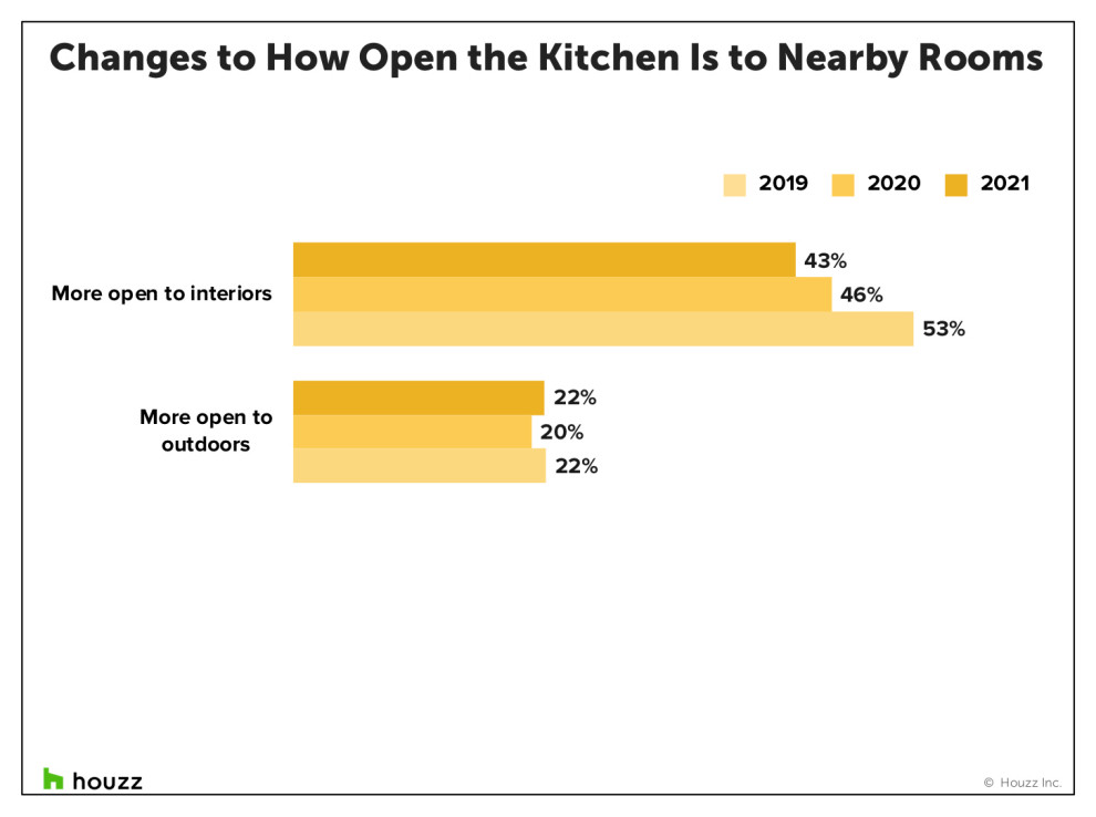 While a smaller share of remodeling homeowners want their kitchens to be open to other indoor spaces, more than 1 in 5 are choosing to open their kitchens to the outdoors. That’s consistent with a steady trend we’ve seen on Houzz of increased demand for outdoor home professionals.
