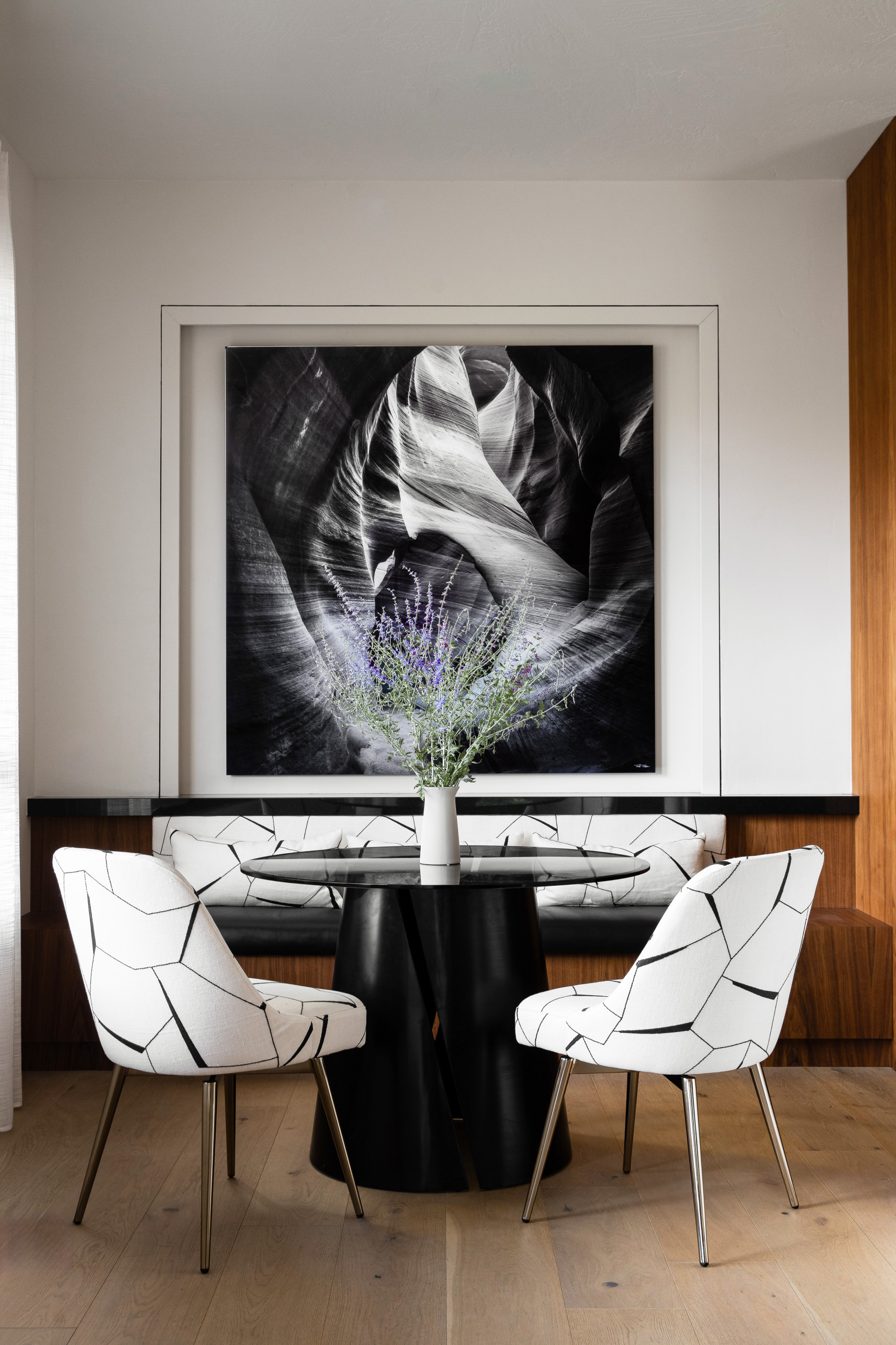 Winter Creative went with a dramatic black-and-white scheme in the dining area of this Sedona, Arizona, home, complementing an oversize photograph of rock striations. The pattern on the chairs calls to mind fractured rocks. A walnut banquette extends from the kitchen cabinets to add a touch of warmth and nod to the rich mountain tones visible through a nearby window.