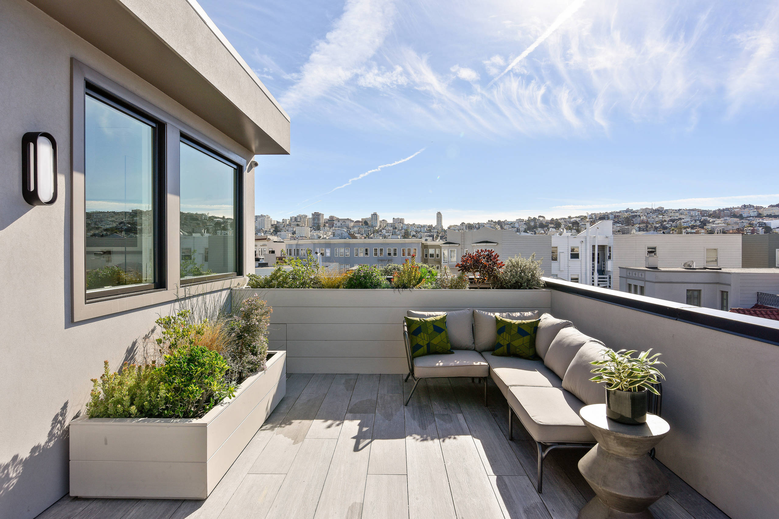 7. Lush urban lounge. This outdoor nook in New York City features a lot of inviting elements, with the sectional sofa, string lights and luxe pillows, but it’s really the potted plants — complete with their colorful containers — that make the scene.