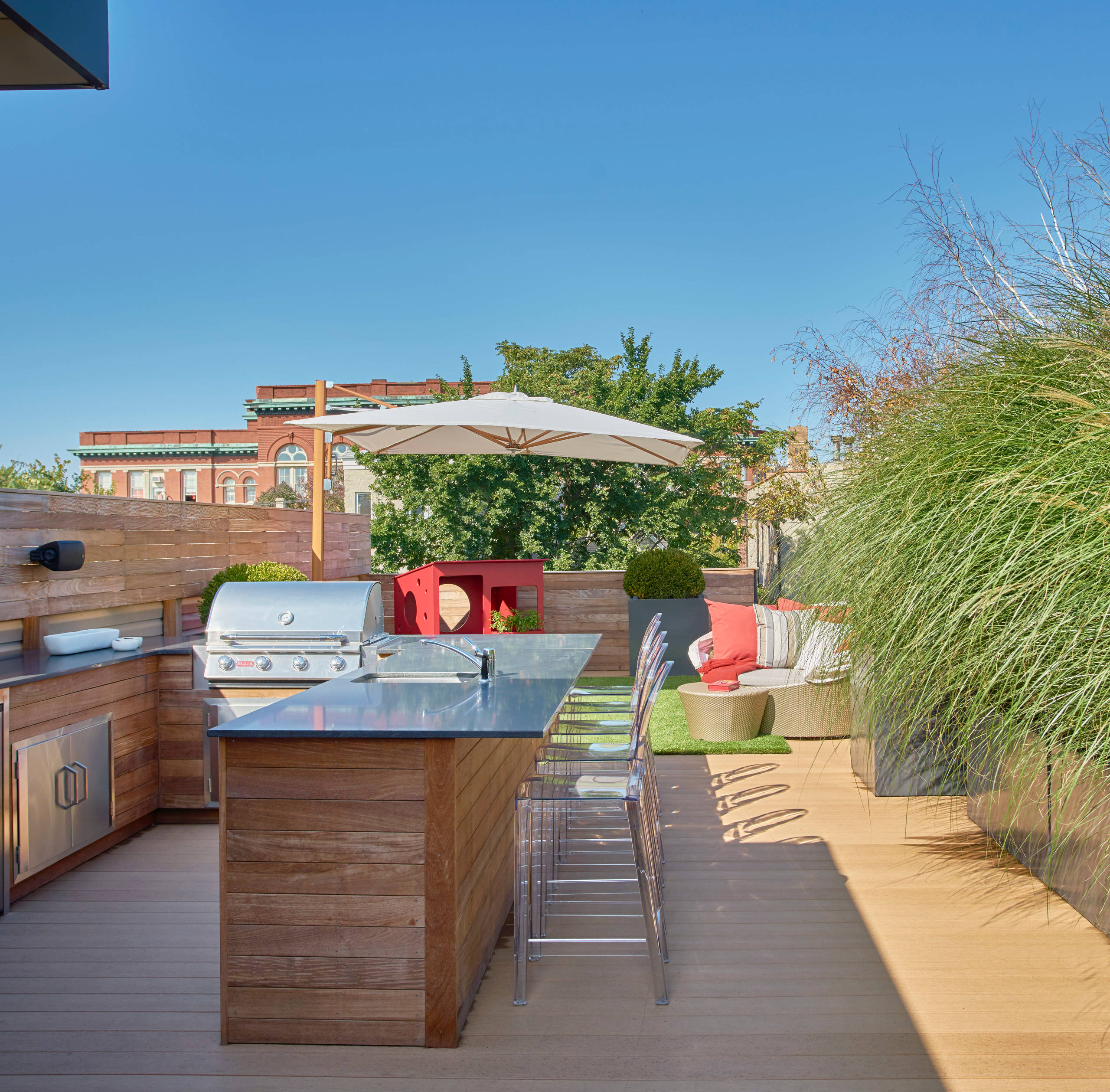 The grasses frame the outdoor kitchen, creating a natural sense of enclosure that’s sure to provide some privacy in this urban space — not to mention the beautiful rustling sound the grasses make in the breeze.