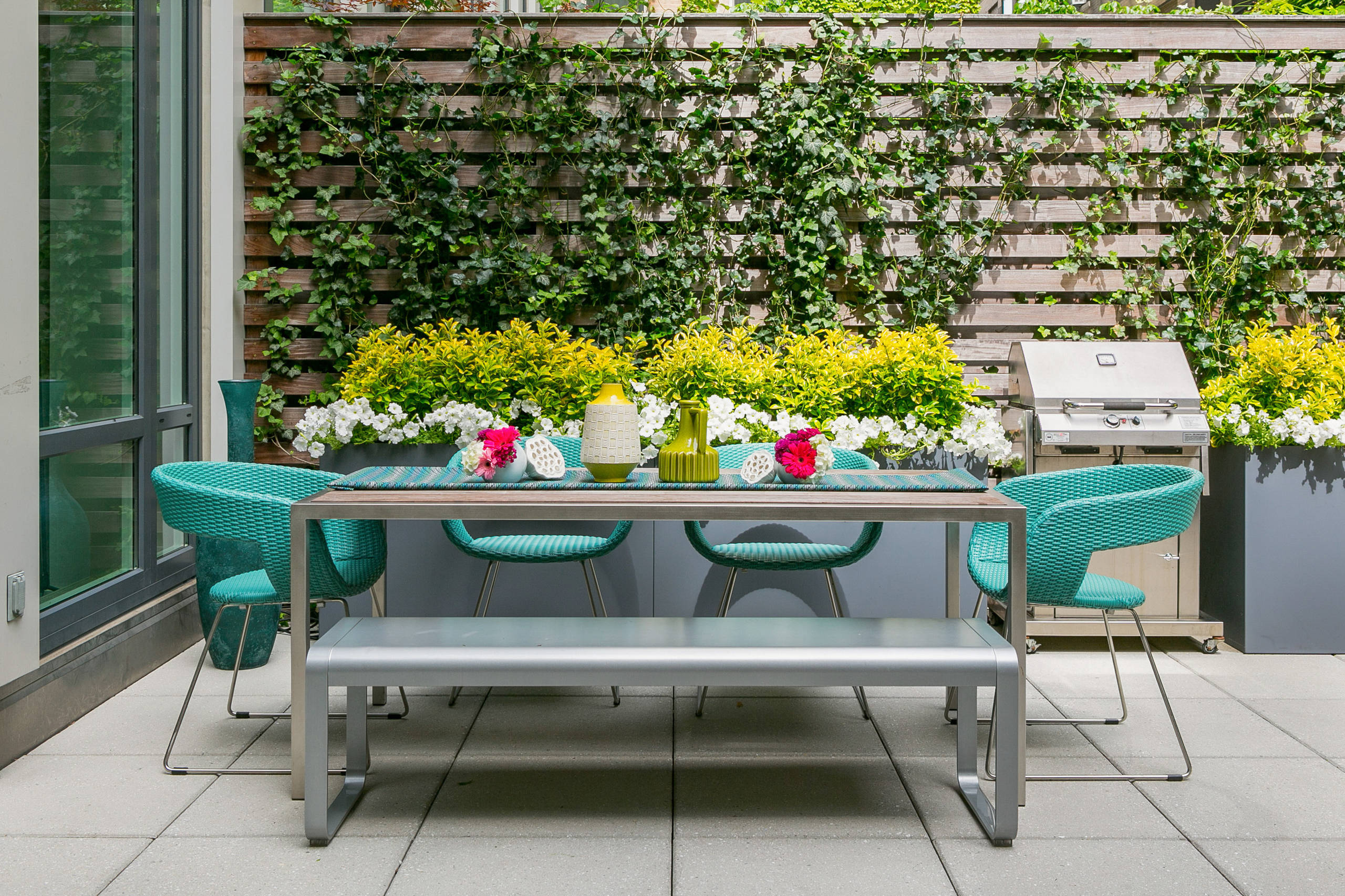10. Feeling of fluorescence. This patio went for a punch of color with the turquoise patio furniture, lime table decor and fuchsia tabletop flowers. Potted annuals and chartreuse-foliaged plants bring that color story up another notch, while also creating an eye-catching backdrop for diners and a visual landing spot between the ground and the wall.
