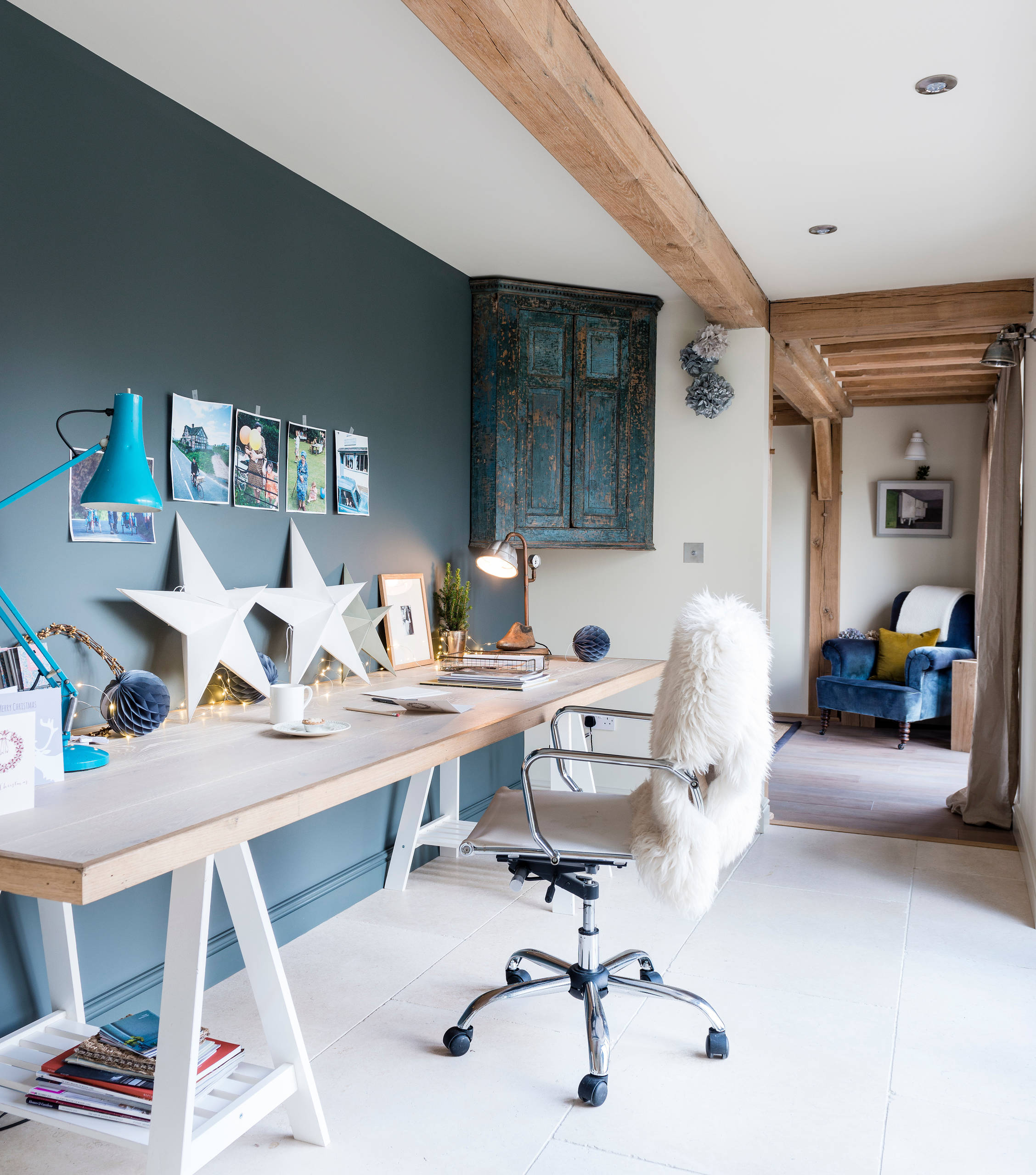 In this home office in England, a large saddlehorse-style desk provides plenty of space for spreading out papers, tackling crafts, and writing cards and letters — the old-fashioned analog kind, of course.