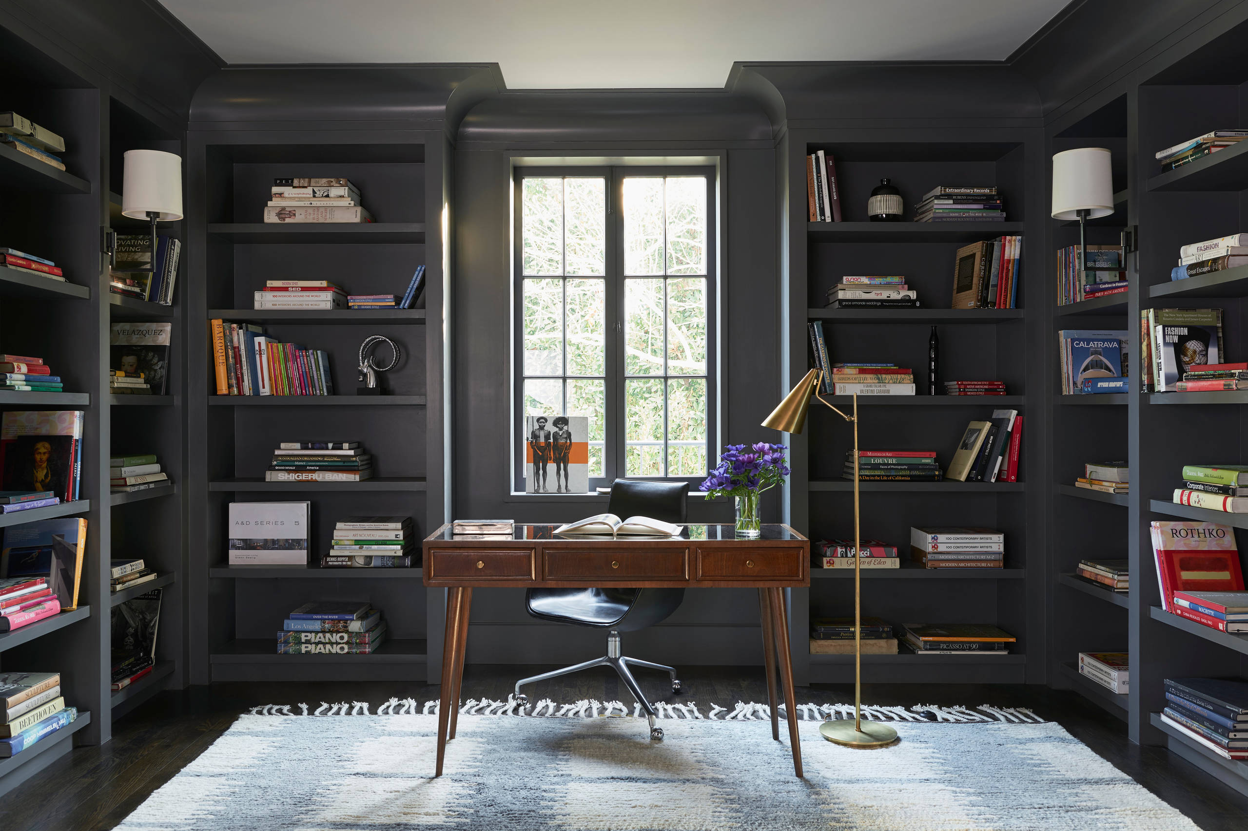 Dark gray built-ins, exaggerated molding and a sleek midcentury-style desk create a moody atmosphere in this Los Angeles home.