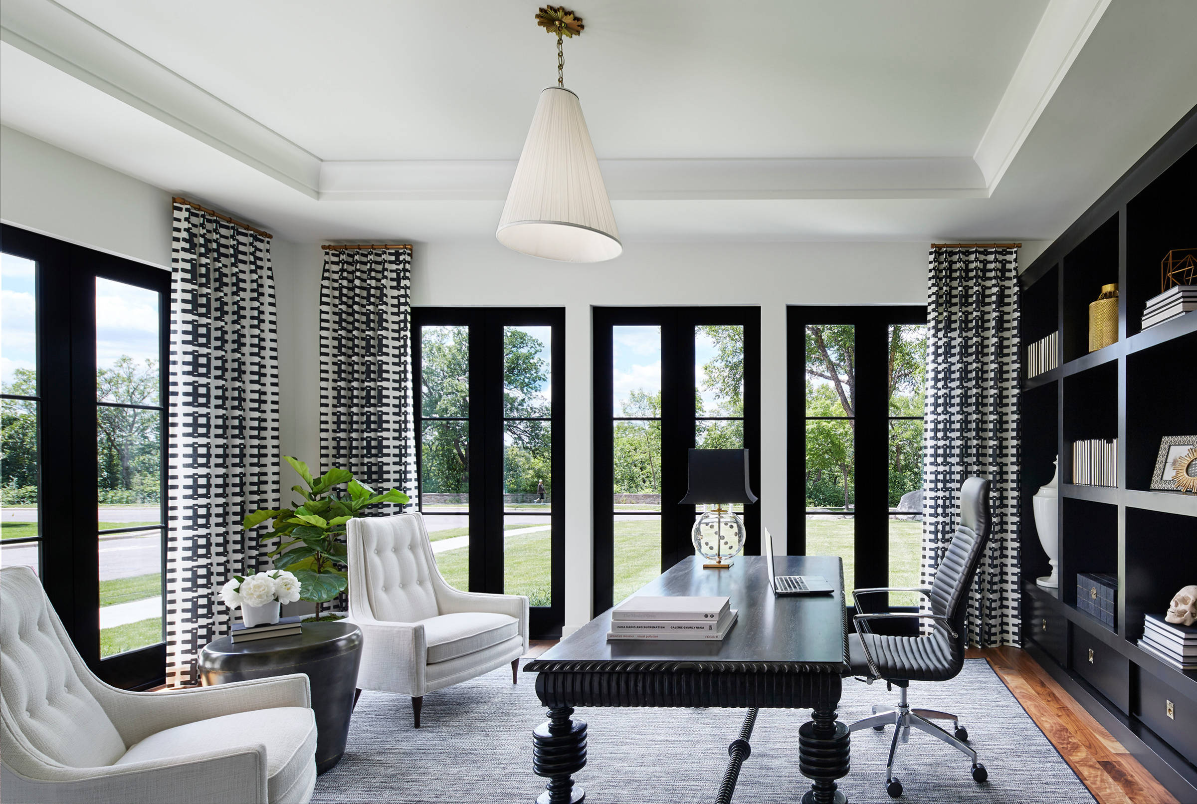 Here, a Dallas office takes on contemporary style with a desk situated in the power position. A contrasting color scheme of black and white-gray exudes a sense of sophistication, as do the complementary textures in the rug and center wall covering.