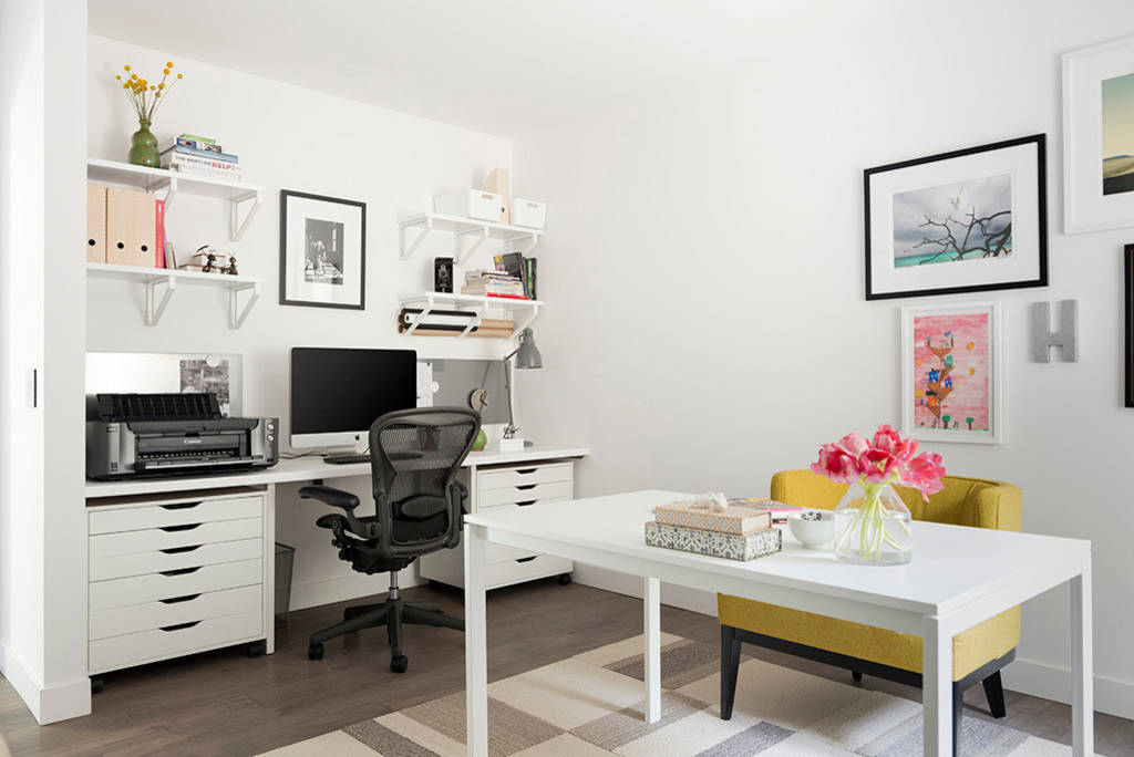 This former children’s bedroom became a postproduction office for a professional photographer, with a separate desk area for processing photos and another for meeting with clients or viewing printouts.