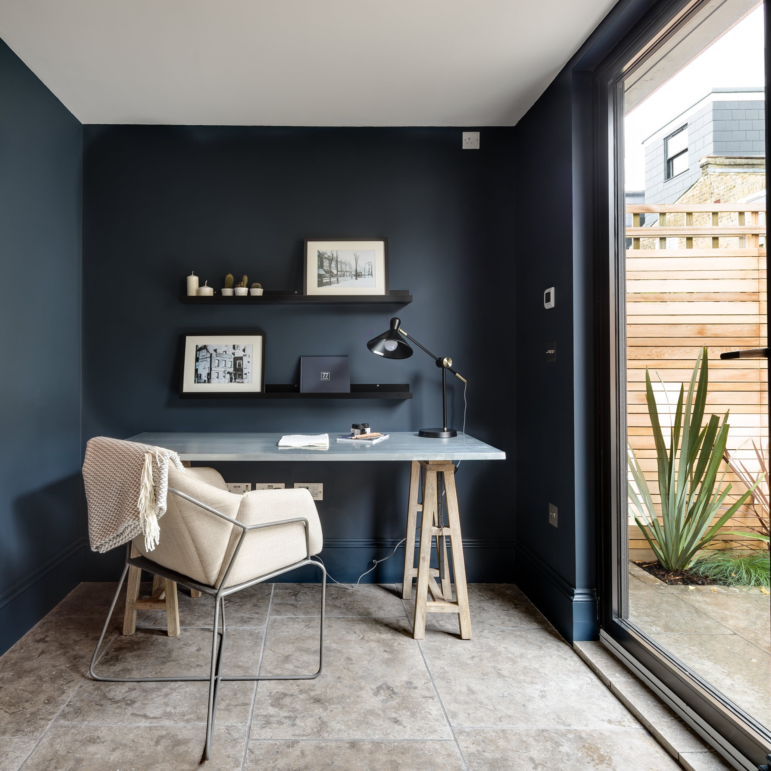 Dark walls, gray stone floors and minimal furnishings set the moody tone in this London office, which opens to an inspiring patio courtyard.