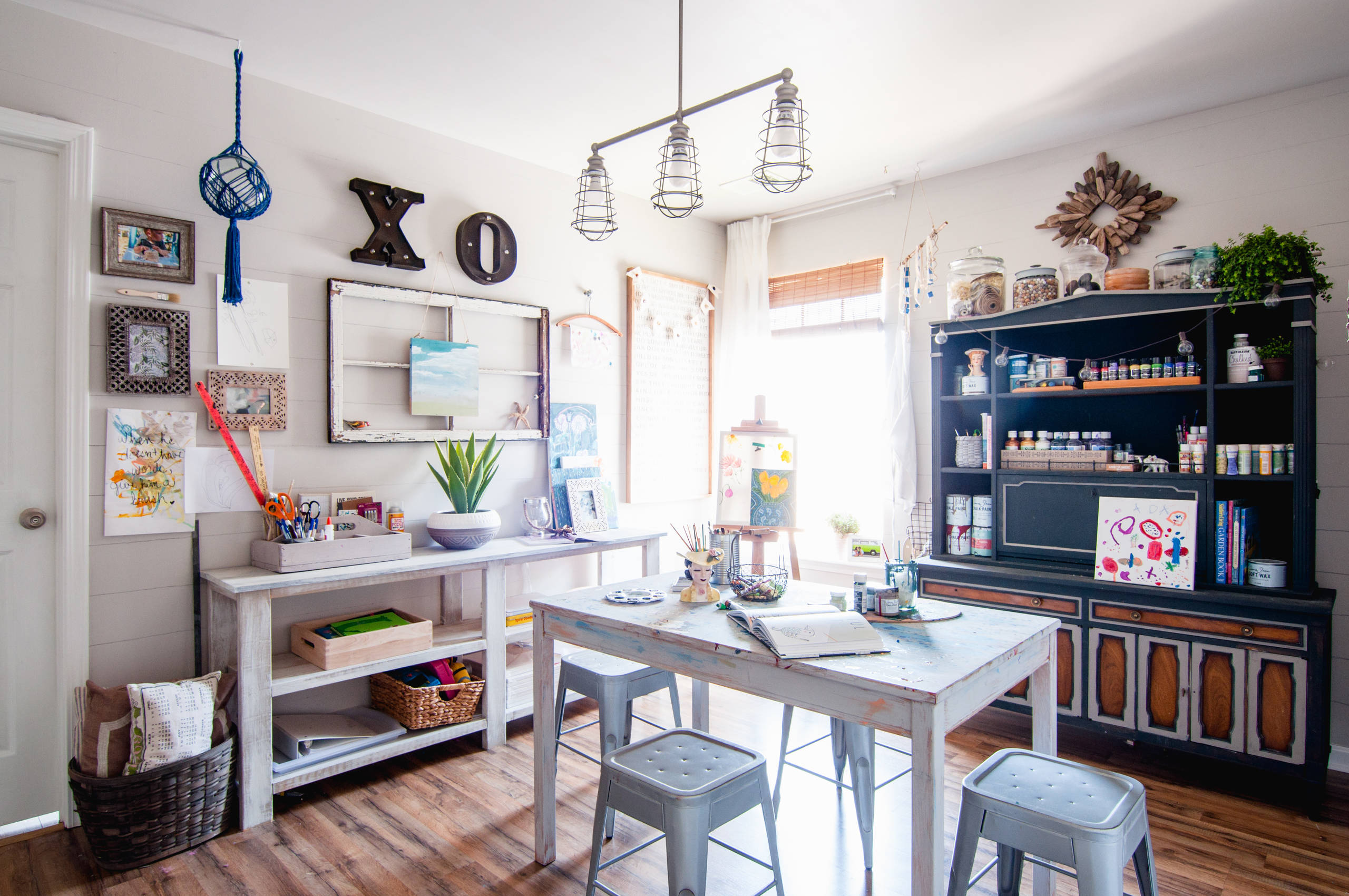 A family art studio constitutes an office in the Georgetown, Kentucky, home of Travis and Amanda Hervey, a freelance writer.