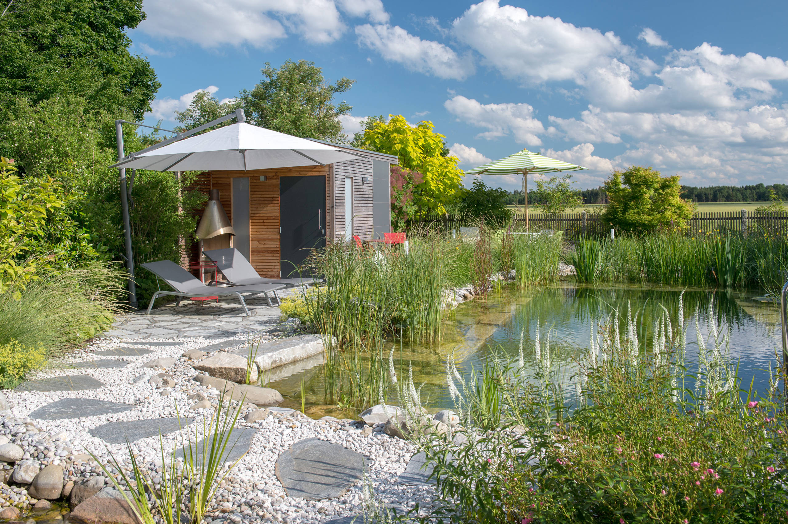 7. Quiet and clean. The clean lines of this outbuilding make for a nice contrast to the natural-looking pool and unrestrained feel of the surrounding foliage.