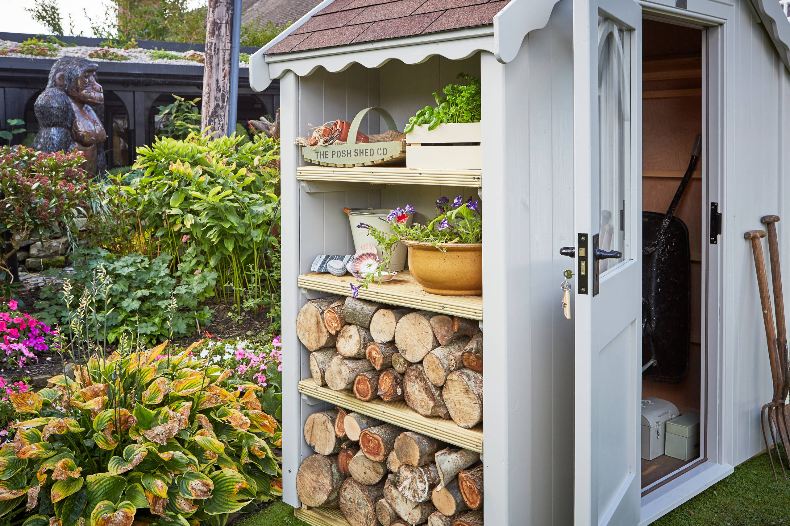 5. Gingerbread house. This cute wood-storing shed offers a handy feature on its left side: shelves for storing chopped logs, pots or tools.