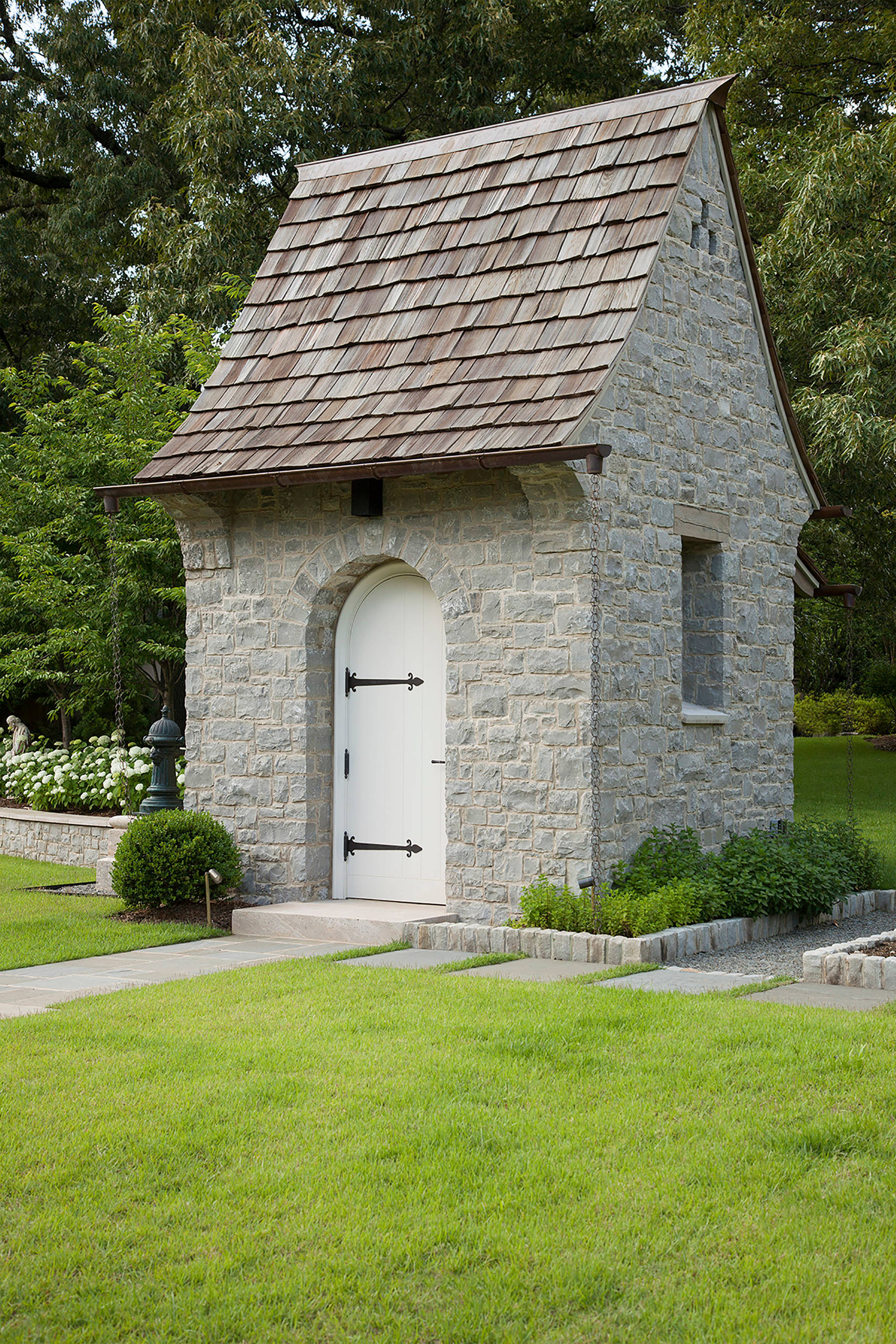 3. Stone classic. This outbuilding to a large home in Memphis echoes the main home’s stonework and the slight arcing in the curve of its roof. The homeowners use it as a garden shed and to store wood for the main home’s fireplace, according to the architect.