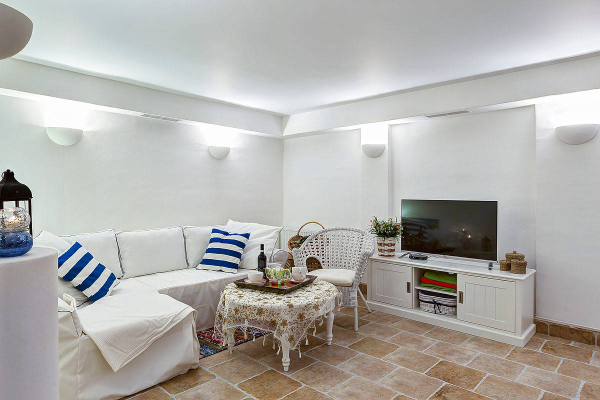 7. Mediterranean inspiration. This basement in Moscow creates a summer vibe, thanks to the patio-style tile floor, wicker furniture and prevailing white color scheme. Blue-and-white-striped pillows add a touch of the coast, though this basement is hundreds of miles away from the nearest oceanfront.