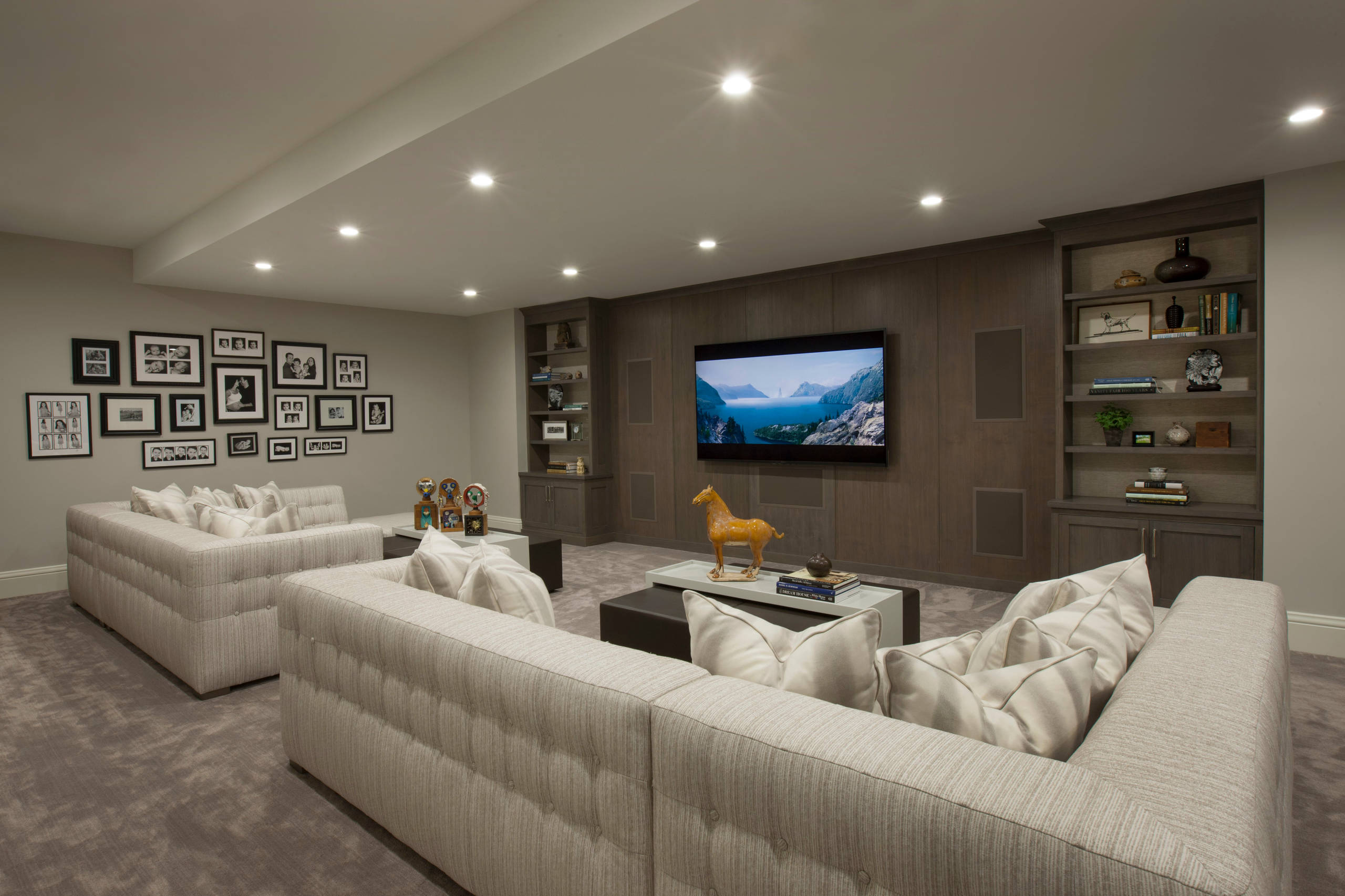 5. Serene screen time. A quiet, neutral palette makes this basement a restful retreat from the daily hubbub. With the walls, sofa upholstery and carpet in subtle grays, greiges and tans, the scene on the large TV becomes the focal point.