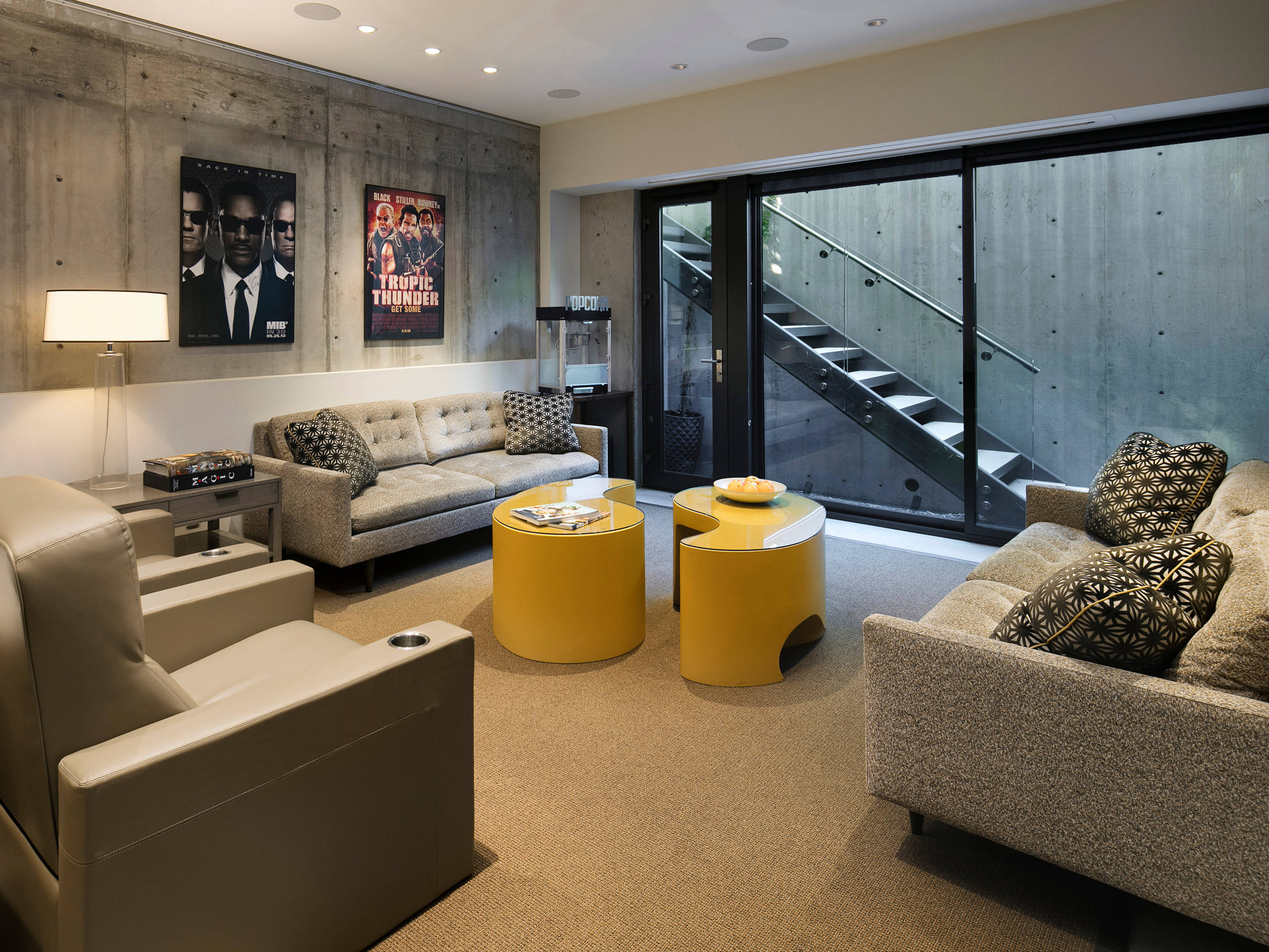10. Hollywood cool. In this Los Angeles basement, movie posters nod to its location near the famous Hollywood sign. The concrete wall and exposed staircase outside the window lend an industrial feel to the space, while beverage holders built into the club chairs (see the left side of the photo) exude luxurious convenience.