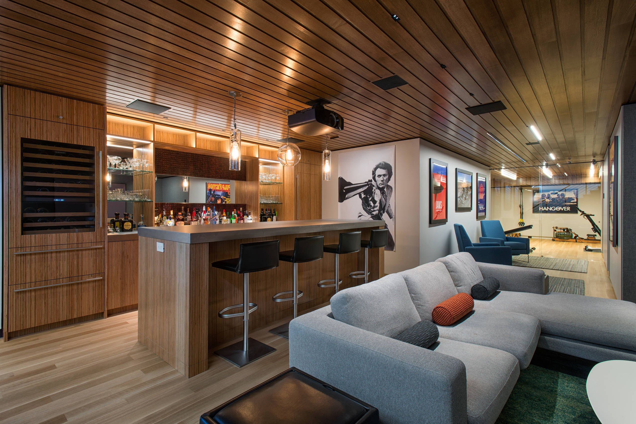 3. Sophisticated grain lines. This East Coast basement feels carefully designed, thanks to its multidirectional wood grains that work harmoniously together: the planked ceilings, the bar and cabinetry, and the wood floor. Understated upholstery for the sofa and bar stools allows the woods in this room to be the star.