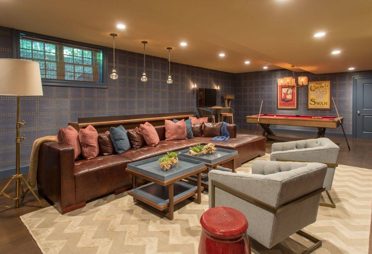 8. Pool party. This Boston basement evokes a hip lounge space, with its windowpane wallpaper, leather sectional, stylish double coffee tables and cozy club chairs. The pool table completes the lounge feel.